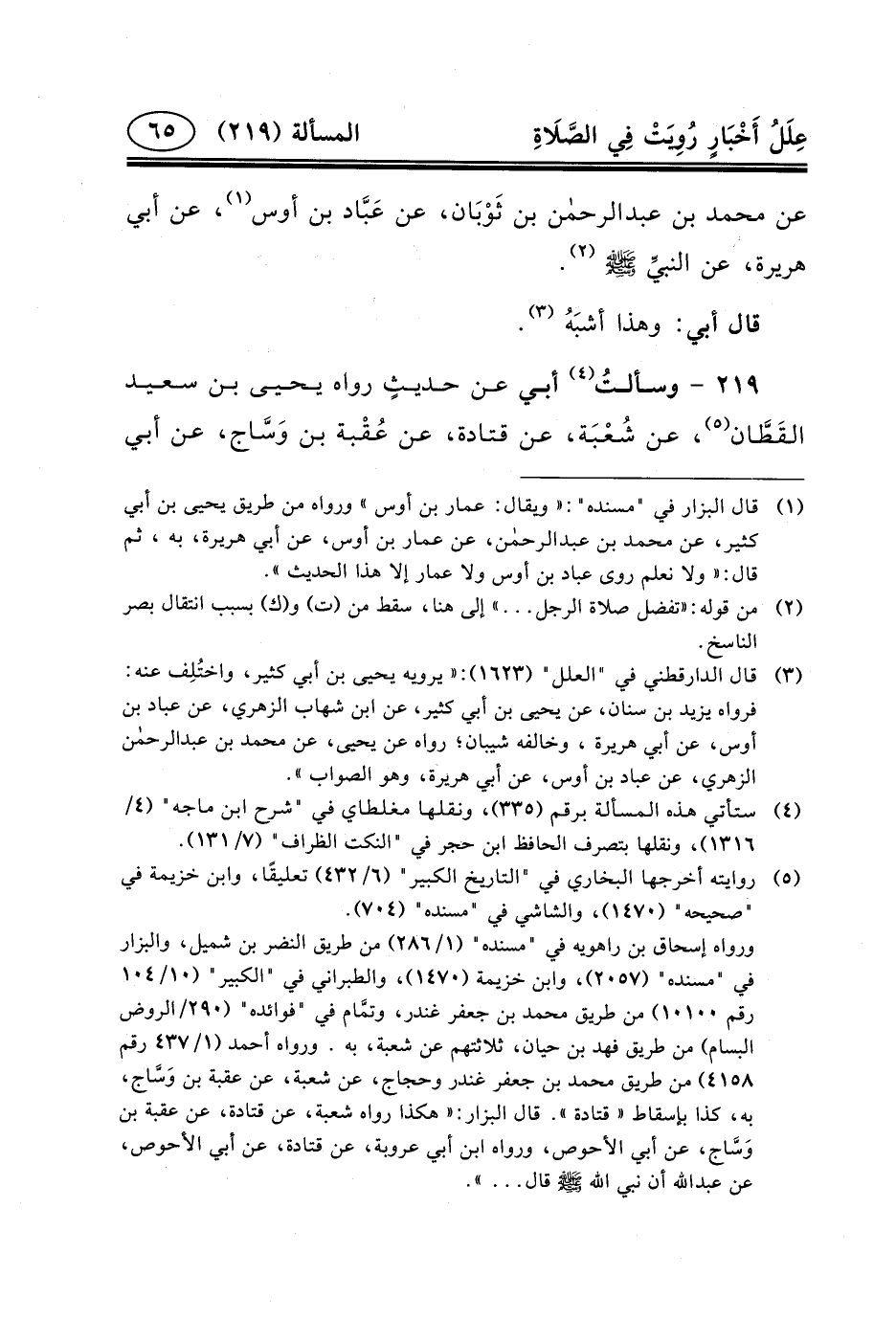 ٢١٩ - وسألتُ (٤) أَبِي عَنْ حديثٍ رَوَاهُ يَحْيَى بْنُ سَعِيدٍ القَطَّان (٥) ، عَنْ شُعْبَة، عَنْ قَتَادَةَ، عَنْ عُقْبة بْنِ وَسَّاج، عن أبي