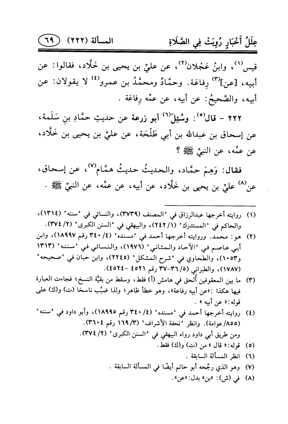 فَقَالَ: وَهِمَ حمَّاد، والحديثُ حديثُ همَّام (٧) ، عَنْ إِسْحَاقَ، عَنْ (٨) عليِّ بن يحيى ابن خَلَاّد، عَنْ أَبِيهِ، عَن عمِّه، عن النبيِّ (ص) .