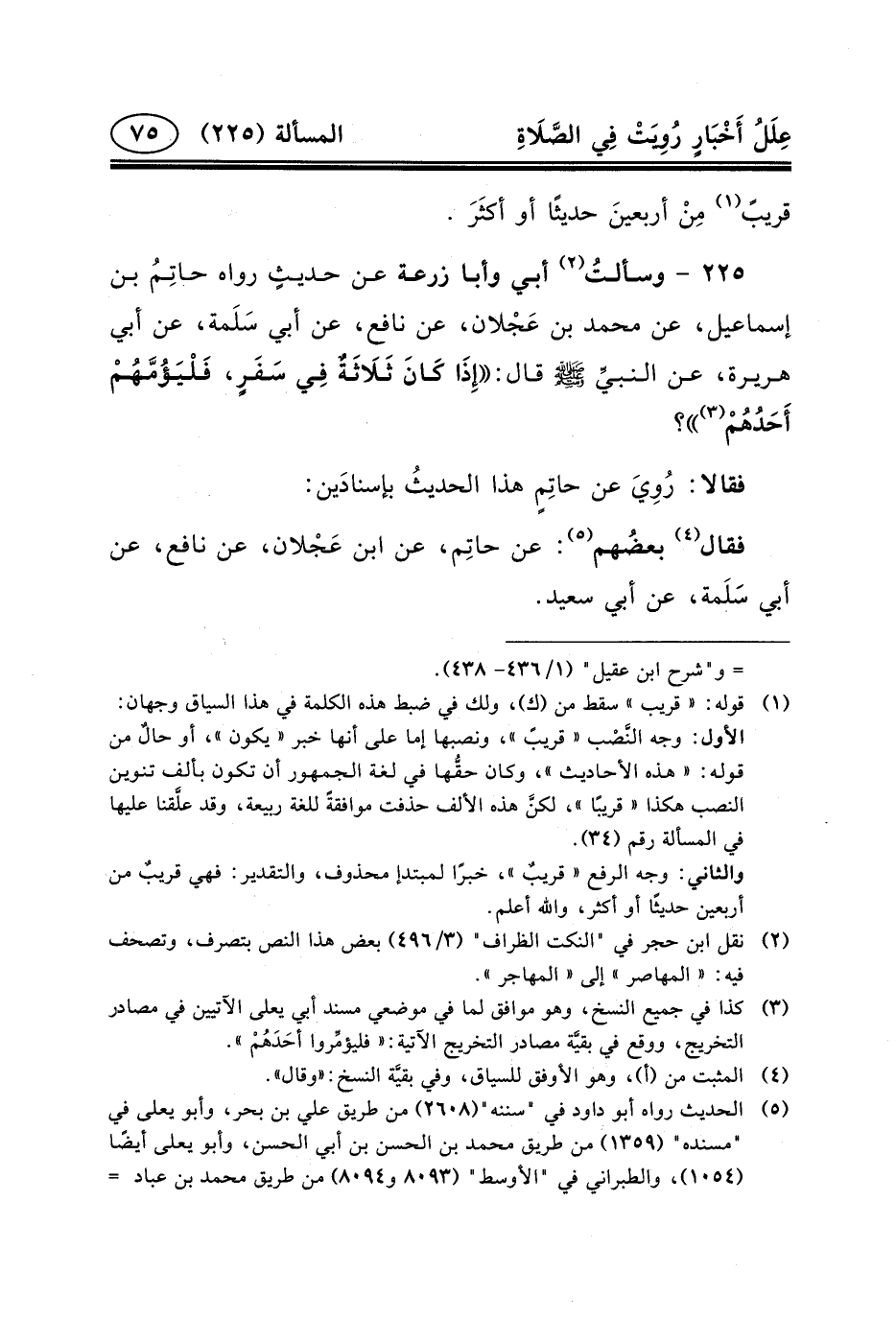 ٢٢٥ - وسألتُ (٢) أَبِي وَأَبَا زُرْعَةَ عَنْ حديثٍ رَوَاهُ حاتِمُ بْنُ إِسْمَاعِيلَ، عَنْ مُحَمَّدِ بْنِ عَجْلان، عَنْ نَافِعٍ، عَنْ أَبِي سَلَمة، عَنْ أَبِي هُرَيْرَةَ، عَنِ النبيِّ (ص) قَالَ: إِذَا كَانَ ثَلَاثَةٌ فِي سَفَرٍ، فَلْيَؤُمَّهُمْ أَحَدُهُمْ (٣) ؟