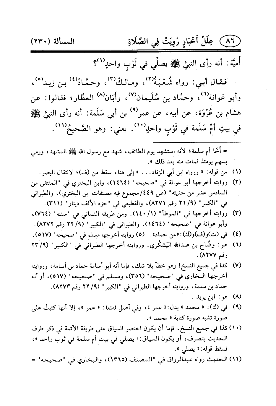 فَقَالَ أَبِي: رَوَاهُ شُعْبَةُ (٣) ، ومالكٌ (٤) ، وحمَّادُ (٥) بْنُ زَيْدٍ (٦) ، وَأَبُو عَوانة (٧) ، وحمَّاد ابن سُلَيمان (٨) ، وأَبَان (٩) العطَّار؛ فقالوا: عَنْ هِشَامِ بْنِ عُرْوَة، عَنْ أَبِيهِ، عَنْ عُمَرَ (١٠) بْنِ أَبِي سَلَمة: أَنَّهُ رأى النبيَّ (ص) في بيتِ أمِّ سَلَمة فِي ثَوْبٍ واحدٍ (١١) .