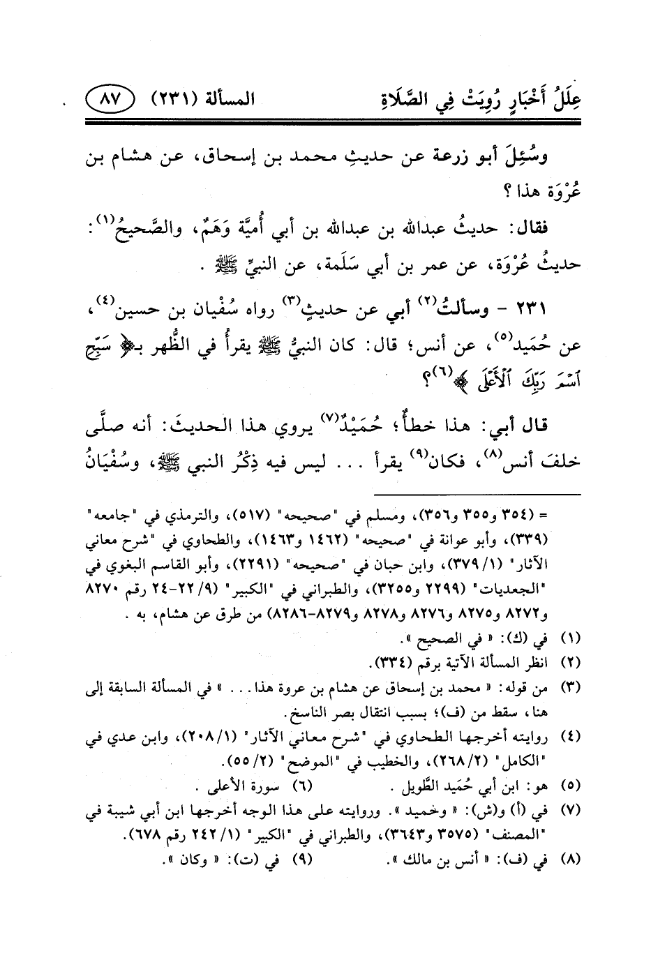 ٢٣١ - وسألتُ (٢) أَبِي عَنْ حديثٍ (٣) رَوَاهُ سُفْيان بْنُ حُسَيْنٍ (٤) ، عَنْ حُمَيد (٥) ، عَنْ أَنَسٍ؛ قَالَ: كَانَ النبيُّ (ص) يقرأُ فِي الظُّهر بِـ {سَبِّحِ اسْمَ رَبِّكَ الأَْعْلَى *} (٦) ؟