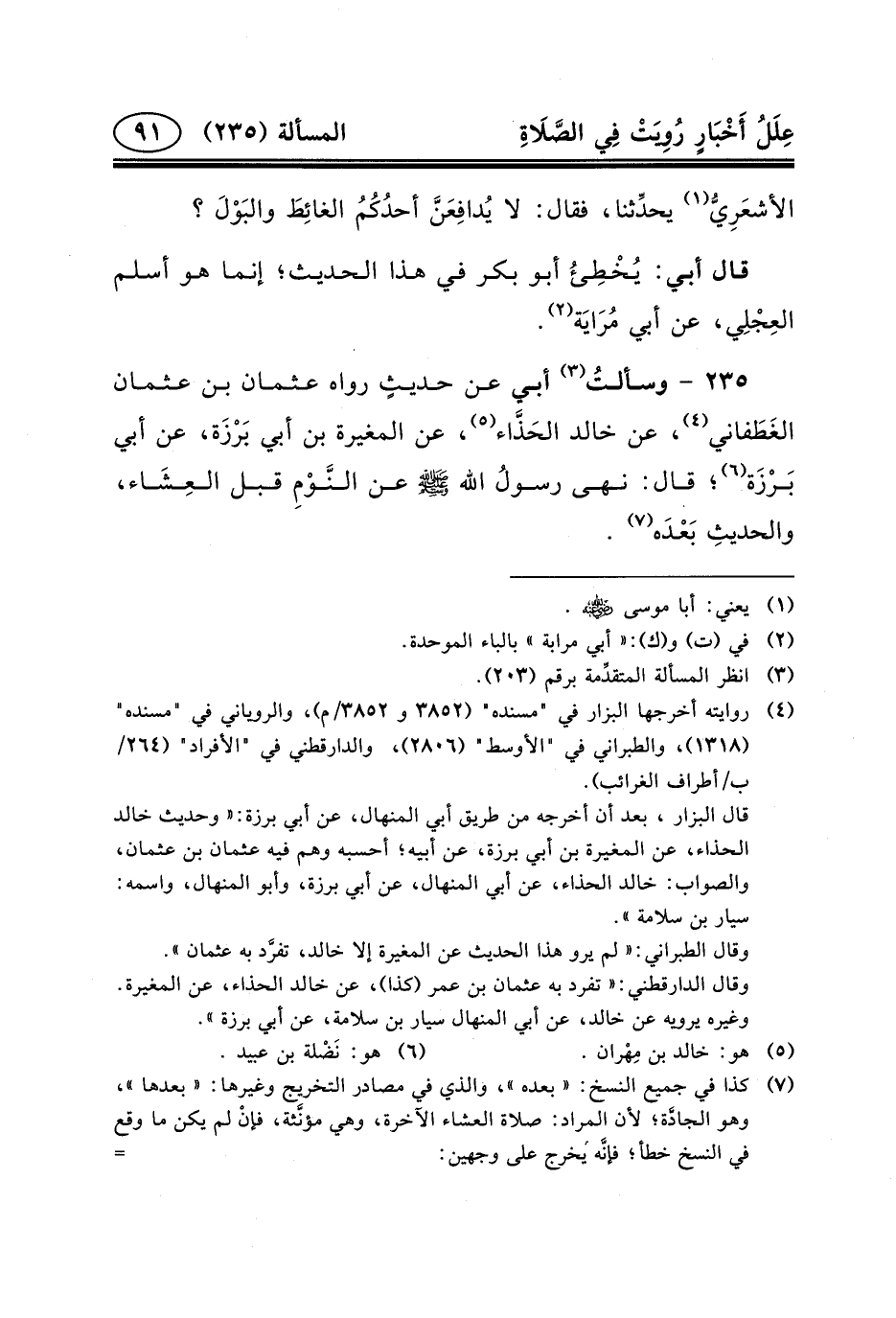 عَنْ خَالِدٍ الحَذَّاء (٥) ، عَنِ الْمُغِيرَةِ بْنِ أَبِي بَرْزَة، عَنْ أَبِي بَرْزَة (٦) ؛ قَالَ: نَهَى رسولُ الله (ص) عَنِ النَّوْمِ قَبْلَ العِشَاء، والحديثِ بَعْدَه (٧) .