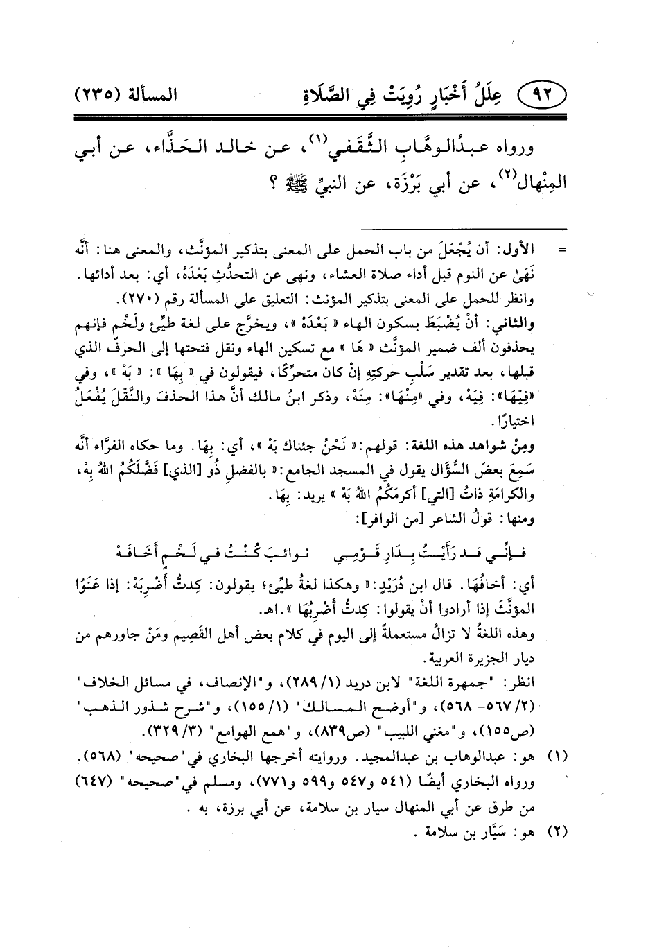 (١) هو: عبد الوهاب بن عبد المجيد. وروايته أخرجها البخاري في"صحيحه" (٥٦٨) . ورواه البخاري أيضًا (٥٤١ و٥٤٧ و٥٩٩ و٧٧١) ، ومسلم في"صحيحه" (٦٤٧) من طرق عن أبي المنهال سيار بن سلامة، عن أبي برزة، به.