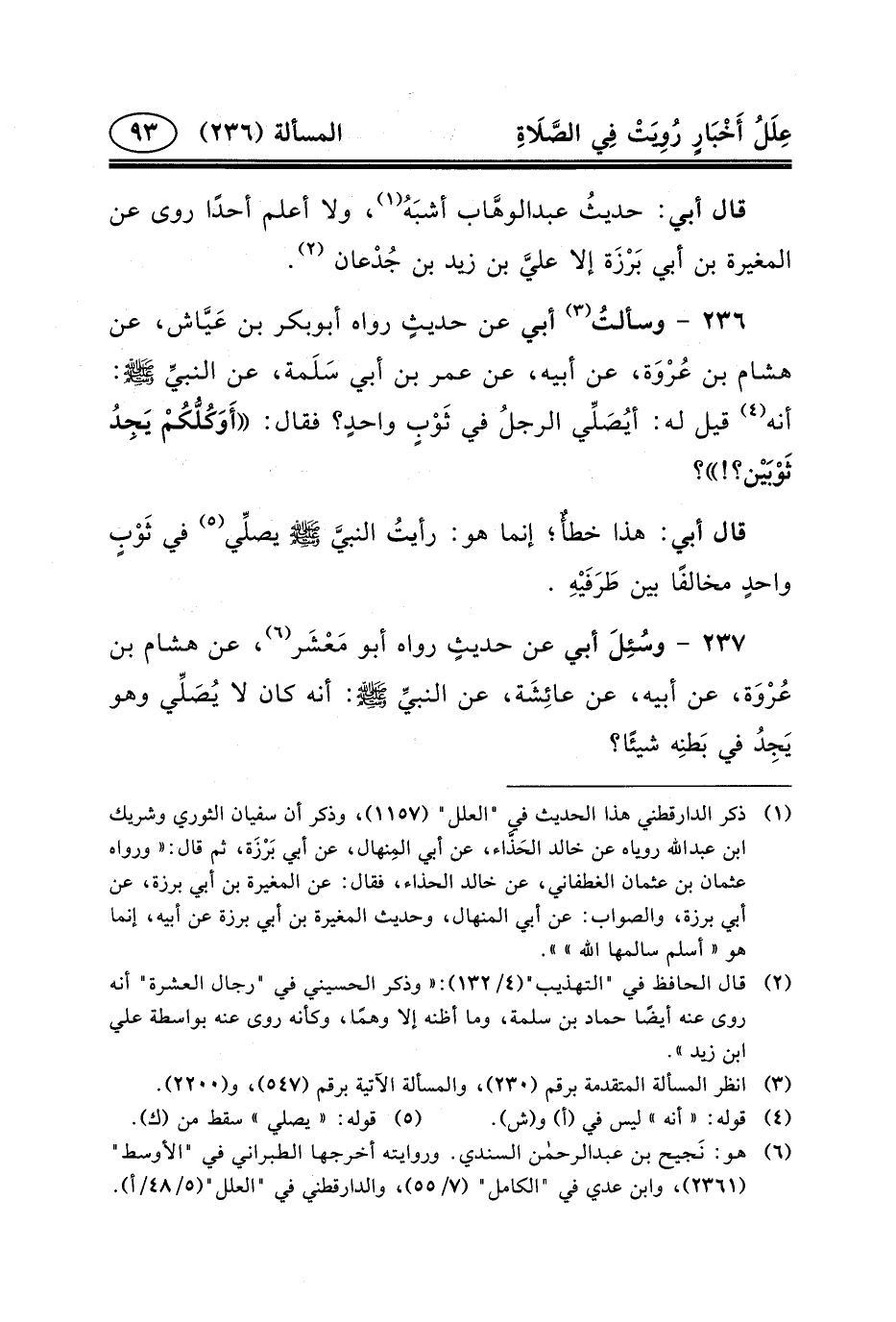 ٢٣٦ - وسألتُ (٣) أَبِي عَنْ حديثٍ رواه أبوبكر بْنُ عَيَّاش، عَنْ هِشَامِ بْنِ عُرْوَة، عَنْ أَبِيهِ، عَنْ عُمَرَ بْنِ أَبِي سَلَمة، عَنِ النبيِّ (ص) : أَنَّهُ (٤) قِيلَ لَهُ: أيُصَلِّي الرجلُ في ثَوْبٍ واحدٍ؟ فقال: أَوَكُلُّكُمْ يَجِدُ ثَوْبَيْن؟! ؟