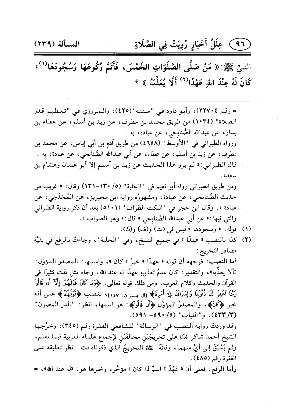 النبيِّ (ص) : مَنْ صَلَّى الصَّلَوَاتِ الخَمْسَ، فَأَتَمَّ رُكُوعَهَا وَسُجُودَهَا (١) ؛ كَانَ لَهُ عِنْدَ اللهِ عَهْدًا (٢) أَلَاّ يُعَذِّبَهُ؟