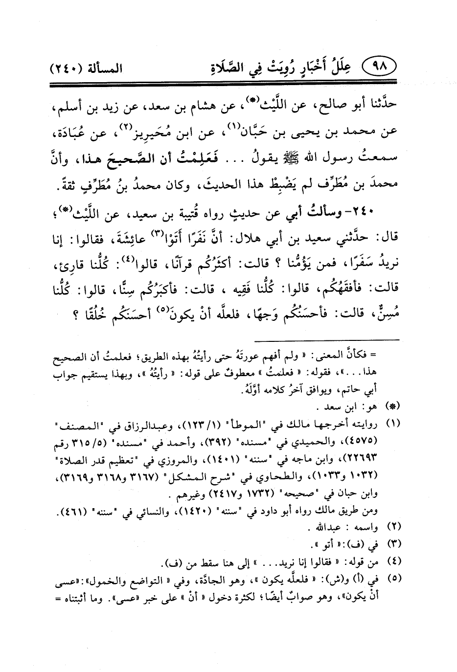 ٢٤٠- وسألتُ أَبِي عن حديثٍ رواه قُتيبة ابن سَعِيدٍ، عَنِ اللَّيْث (*) ؛ قَالَ: حدَّثني سعيد ابن أَبِي هِلالٍ: أنَّ نَفَرًا أَتَوْا (٣) عائِشَةَ، فَقَالُوا: إِنَّا نريدُ سَفَرًا، فَمَنْ يَؤُمُّنا؟ قَالَتْ: أكثَرُكُم قُرْآنًا، قَالُوا (٤) : كُلُّنا قارِئ، قَالَتْ: فأفقَهُكُم، قَالُوا: كُلُّنا فَقِيه، قَالَتْ: فأكبَرُكُم سِنًّا، قَالُوا: كُلُّنا مُسِنٌّ، قَالَتْ: فأحسَنُكُم وَجهًا، فلعلَّه أنْ يكونَ (٥)