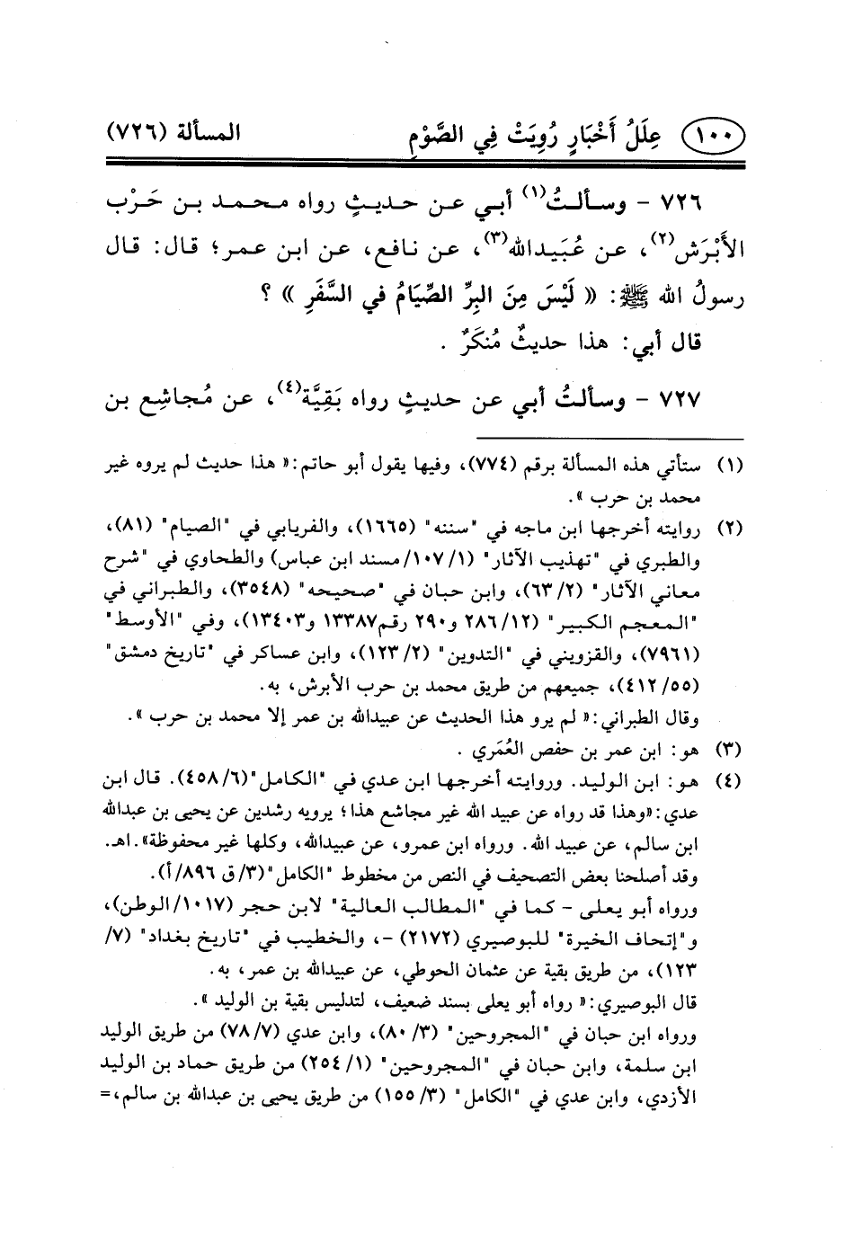 ٧٢٦ - وسألتُ (١) أَبِي عَنْ حديثٍ رَوَاهُ مُحَمَّدُ بْنُ حَرْب الأَبْرَش (٢) ، عَنِ عُبَيدالله (٣) ، عَنْ نَافِعٍ، عَنِ ابْنِ عُمَرَ؛ قال: قال رسولُ الله (ص) : لَيْسَ مِنَ البِرِّ الصِّيَامُ فِي السَّفَرِ؟
