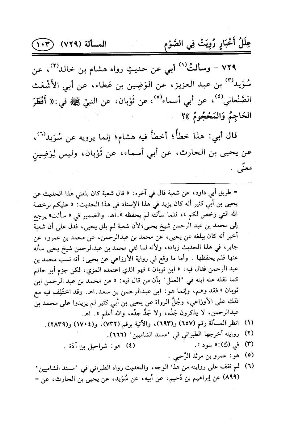 ٧٢٩ - وسألتُ (١) أَبِي عَنْ حديثٍ رَوَاهُ هِشَامُ بْنُ خَالِدٍ (٢) ، عَنْ سُوَيد (٣) بن عبد العزيز، عَنِ الوَضِين بْنِ عَطاء، عَنْ أَبِي الأَشْعَث الصَّنْعاني (٤) ، عَنْ أَبِي أَسْمَاءَ (٥) ، عَنْ ثَوْبان، عَنِ النبيِّ (ص) في: أَفْطَرَ الحَاجِمُ وَالمَحْجُومُ؟