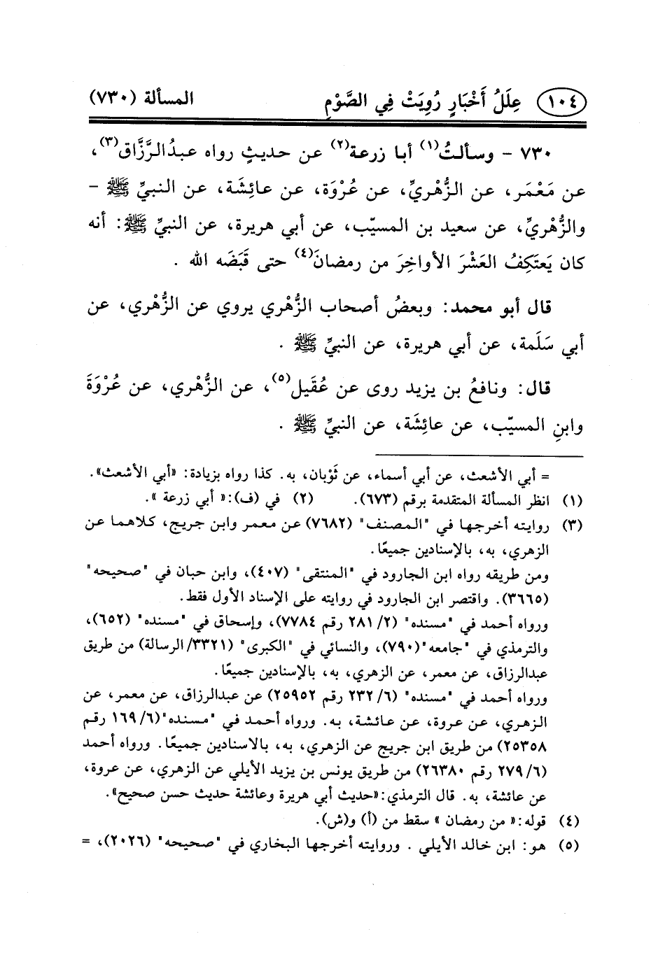 عَنْ مَعْمَر، عَنِ الزُّهْريِّ، عَنْ عُرْوَة، عَنْ عائِشَة، عَنِ النبيِّ (ص) - والزُّهْريِّ، عَنْ سَعِيدِ بْنِ الْمُسَيِّبِ، عَنْ أَبِي هُرَيْرَةَ، عَنِ النبيِّ (ص) : أَنَّهُ كَانَ يَعتَكِفُ العَشْرَ الأواخِرَ مِنْ رمضانَ (٤) حَتَّى قَبَضَه اللَّهُ.