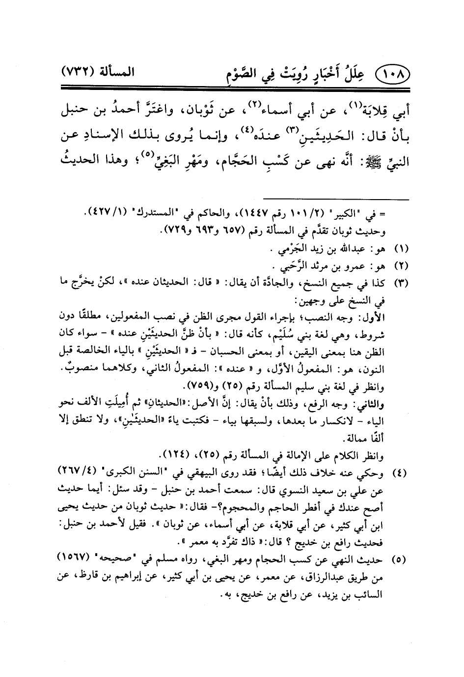 أَبِي قِلابَة (١) ، عَنْ أَبِي أَسْمَاءَ (٢) ، عَنْ ثَوْبان، واغتَرَّ أحمدُ بْنُ حنبل بأنْ قال: الحَدِيثَينِ (٣)