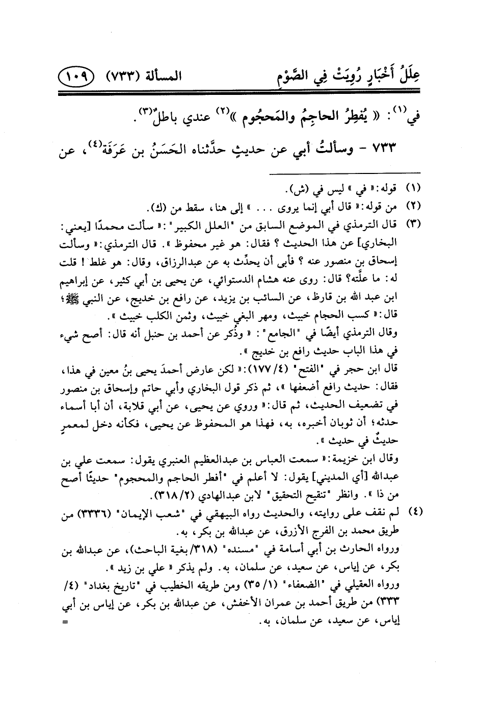 وقال ابن خزيمة: «سمعت العباس بن عبد العظيم العنبري يقول: سمعت علي بن عبد الله [أي المديني] يقول: لا أعلم في "أفطر الحاجم والمحجوم" حديثًا أصح من ذا» . وانظر "تنقيح التحقيق" لابن عبد الهادي (٢/٣١٨) .