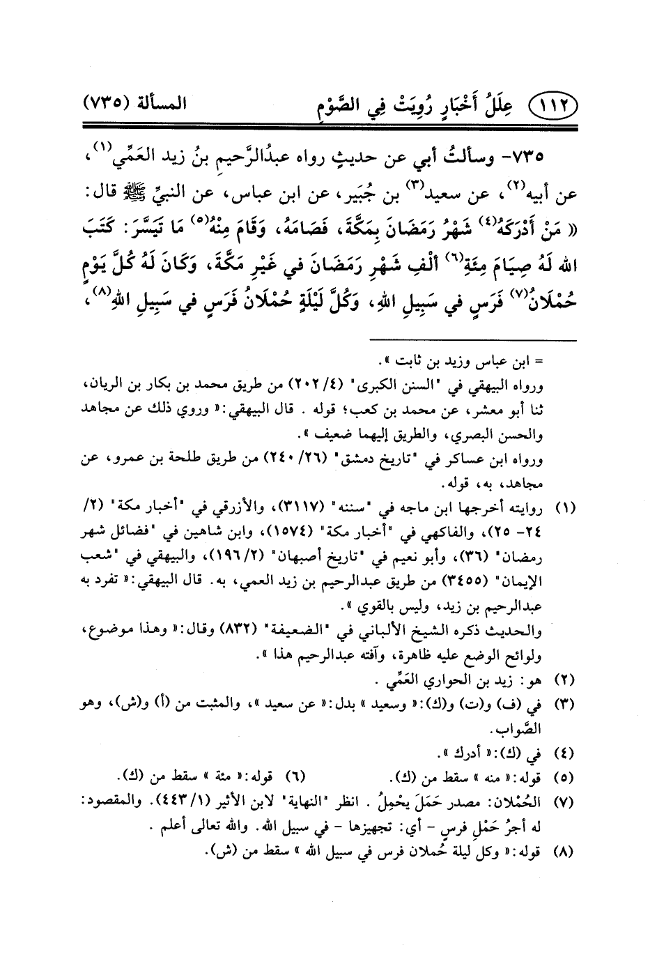عَنْ أَبِيهِ (٢) ، عَنْ سَعِيدِ (٣) بْنِ جُبَير، عَنِ ابن عباس، عن النبيِّ (ص) قَالَ: مَنْ أَدْرَكَهُ (٤) شَهْرُ رَمَضَانَ بِمَكَّةَ، فَصَامَهُ، وَقَامَ مِنْهُ (٥) مَا تَيَسَّرَ: كَتَبَ اللَّهُ لَهُ صِيَامَ مِئَةِ (٦) ألْفِ شَهْرِ رَمَضَانَ فِي غَيْرِ مَكَّةَ، وَكَانَ لَهُ كُلَّ يَوْمٍ حُمْلَانُ (٧) فَرَسٍ فِي سَبِيلِ اللهِ، وَكُلَّ لَيْلَةٍ حُمْلَانُ فَرَسٍ فِي سَبِيلِ اللهِ (٨) ،