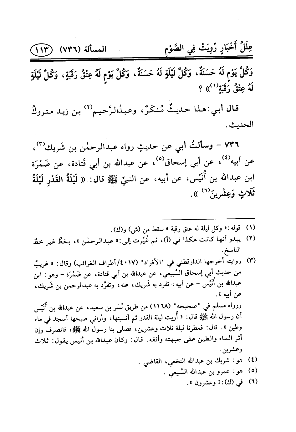 ٧٣٦ - وسألتُ أَبِي عن حديثٍ رواه عبد الرحمن بْنُ شَريك (٣) ،