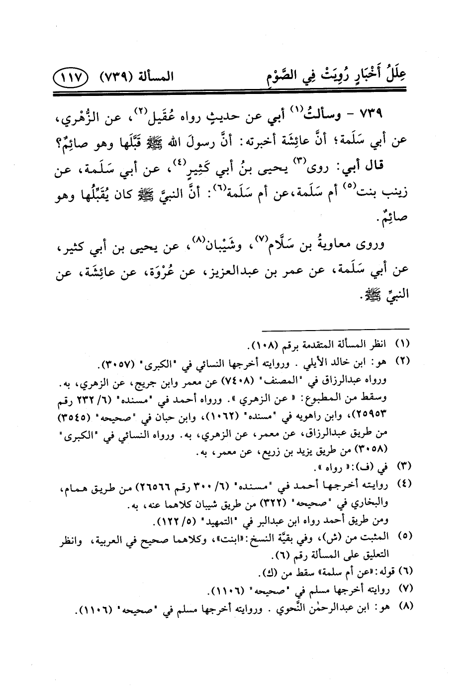 قَالَ أَبِي: رَوَى (٣) يَحْيَى بنُ أَبِي كَثِيرٍ (٤) ، عَنْ أَبِي سَلَمة، عَنْ زَيْنَبَ بِنْتِ (٥) أُمِّ سَلَمة، عَنْ أُمِّ سَلَمة (٦) : أنَّ النبيَّ (ص) كَانَ يُقَبِّلُها وَهُوَ صائِمٌ.