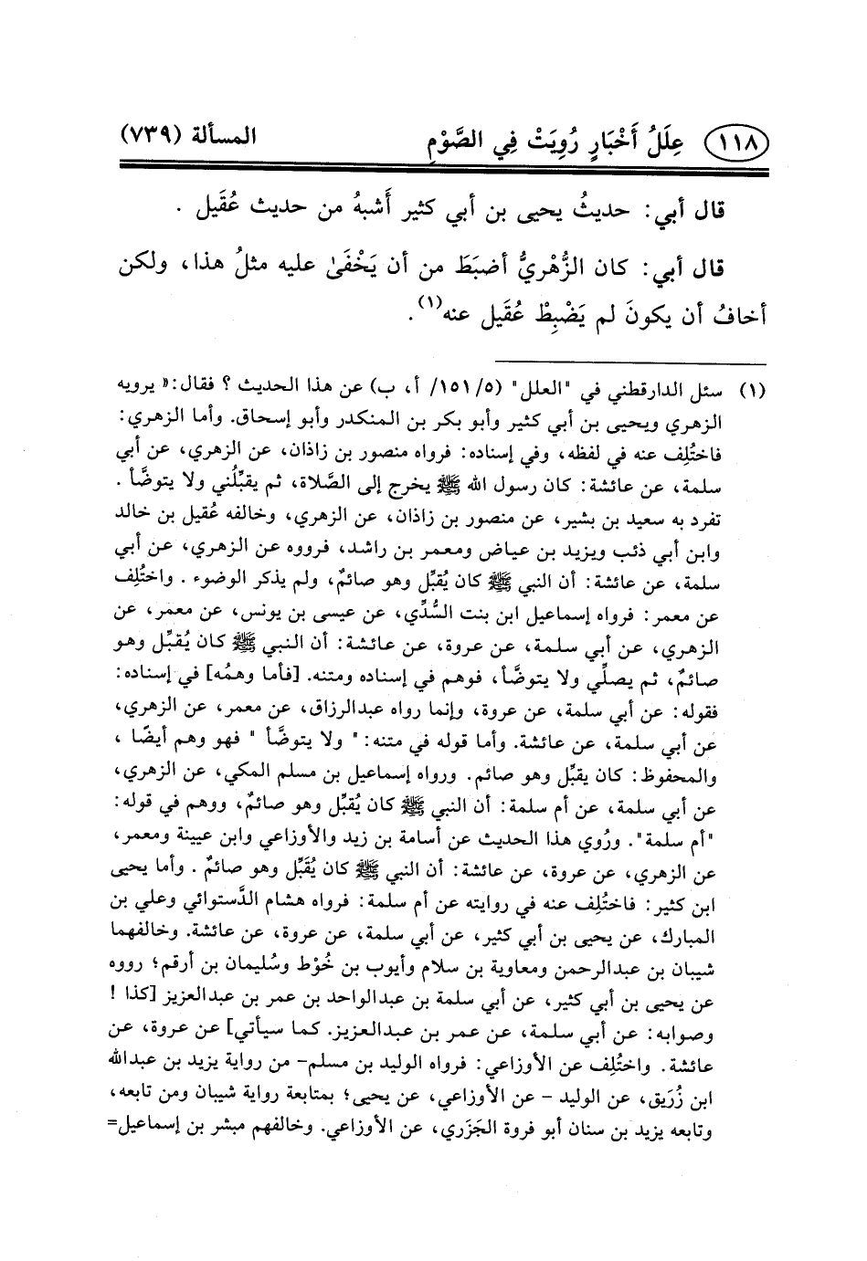 (١) سئل الدارقطني في "العلل" (٥/١٥١/ أ، ب) عن هذا الحديث؟ فقال: «يرويه الزهري ويحيى بن أبي كثير وأبو بكر بن المنكدر وأبو إسحاق. وأما الزهري: فاختُلِف عنه في لفظه، وفي إسناده: فرواه مَنْصُورِ بْنِ زَاذَانَ، عَنِ الزُّهْرِيِّ، عَنْ أَبِي سَلَمَةَ، عَنْ عَائِشَةَ: كان رسول الله (ص) يخرج إلى الصَّلاة، ثم يقبِّلُني ولا يتوضَّأ. تفرد به سَعِيدُ بْنُ بَشِيرٍ، عَنْ مَنْصُورِ بن زاذان، عن الزهري، وخالفه عُقيل بن خالد وابن أبي ذئب ويزيد ابن عياض ومعمر بن راشد، فرووه عَنِ الزُّهْرِيِّ، عَنْ أَبِي سَلَمَةَ، عن عائشة: أن النبي (ص) كان يُقبِّل وهو صائمٌ، ولم يذكر الوضوء. واختُلِف عن معمر: فرواه إسماعيل ابن بنت السُّدِّي، عَنْ عِيسَى بْنِ يُونُسَ، عَنْ مَعْمَرٌ، عَنِ الزُّهْرِيِّ، عَنْ أَبِي سلمة، عَنْ عُرْوَةَ، عَنْ عَائِشَةَ: أَنَّ النبي (ص) كان يُقبِّل وهو صائمٌ، ثم يصلِّي ولا يتوضَّأ، فوهم في إسناده ومتنه. [فأما وهمُه] في إسناده: فقوله: عن أبي سلمة، عن عروة، وإنما رواه عبد الرزاق، عَنْ مَعْمَرٍ، عَنِ الزُّهْرِيِّ، عَنْ أبي سلمة، عن عائشة. وأما قوله في متنه: " ولا يتوضَّأ " فهو وهم أيضًا، والمحفوظ: كان يقبِّل وهو صائم. ورواه إِسْمَاعِيلُ بْنُ مُسْلِمٍ الْمَكِّيُّ، عَنِ الزُّهْرِيُّ، عَنْ أَبِي سَلَمَةَ، عَنْ أم سلمة: أن النبي (ص) كان يُقبِّل وهو صائمٌ، ووهم في قوله: "أم سلمة". ورُوي هذا الحديث عن أسامة بن زيد والأوزاعي وابن عيينة ومعمر، عَن الزُّهْرِيّ، عَنْ عُرْوَةَ، عَن عائشة: أن النبي (ص) كان يُقَبِّل وهو صائمٌ. وأما يحيى ابن كثير: فاختُلِف عنه في روايته عن أم سلمة: فرواه هشام الدَّستوائي وعلي بْن الْمُبَارَك، عَنْ يَحْيَى بْنِ أَبِي كَثِيرٍ، عَنْ أَبِي سلمة، عن عروة، عن عائشة..وخالفهما شيبان ابن عبد الرحمن ومعاوية بن سلام وأيوب بن خُوْط وسُليمان بن أرقم؛ رووه عَنْ يَحْيَى بْنِ أَبِي كَثِيرٍ، عن أبي سلمة بن عبد الواحد بن عمر بن عبد العزيز [كذا! وصوابه: عَنْ أَبِي سَلَمَةَ، عَنْ عُمَرَ بن عبد العزيز. كما سيأتي] عن عروة، عن عائشة. واختُلِف عن الأوزاعي: فرواه الوليد بن مسلم- من رواية يزيد بن عبد الله ابن زُرَيق، عن الوليد - عن الأوزاعي، عن يحيى؛ بمتابعة رواية شيبان ومن تابعه، وتابعه يزيد بن سنان أبو فروة الجَزَري، عن الأوزاعي. وخالفهم مبشر ابن إسماعيل وهِقْل، فروياه عَنِ الأَوْزَاعِيِّ، عَنْ يَحْيَى، [عَنْ] أبي سلمة، عن عائشة. والقول قول شيبان ومن تابعه ممن ذكر فيه عمر بن عبد العزيز. ورواه يحيى = = ابن أبي كثير بإسناد آخر، واختُلِف عنه فيه أيضًا: فرواه الأَوْزَاعِيِّ، عَنْ يَحْيَى، عَنْ أَبِي سلمة، عن أم سلمة، وخالفه معاوية بن سلام وشيبان وهشام الدَّستوائي؛ فرووه عَنْ يَحْيَى، عَنْ أَبِي سَلَمَةَ، عن زينب، عن أم سلمة، وكذلك رواه أبو بكر بن المنكدر، عَنْ أَبِي سَلَمَةَ، عَنْ زَيْنَبَ، عن أم سلمة؛ قاله بكر بن الأشجع عنه، ونكتب ذلك في مسند أم سلمة إن شاء الله» . اهـ.