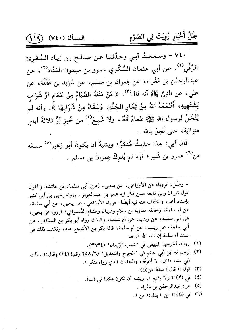 ٧٤٠ - وسمعتُ أَبِي وحدَّثنا عَنْ صَالِحِ بْنِ زِيَادٍ المُقرِئ الرَّقِّي (١) ، عَنْ أَبِي عُثْمَانَ السُّكَّري عَمْرِو بْنِ ميمون القَنَّاد (٢) ، عن عبد الرحمن بْنِ مَغْراء، عَنْ عِمران بْنِ مُسْلِمٍ، عَنْ سُوَيد بْنِ غَفَلَة، عن علي، عن النبيِّ (ص) أَنَّهُ قَالَ (٣) : مَنْ مَنَعَهُ الصِّيَامُ مِنْ طَعَامٍ أوْ شَرَابٍ يَشْتَهِيهِ، أَطْعَمَهُ اللهُ مِنْ ثِمَارِ الجَنَّةِ، وَسَقَاهُ مِنْ شَرَابِهَا. وَإِنَّهُ لَمْ يُنْخَلْ لرسول الله (ص) طعامٌ قَطُّ، وَلا شَبِعَ (٤) مِنْ خُبزِ بُرٍّ ثلاثةَ أيام ٍ مُتَوَالِيَةٍ، حَتَّى لَحِقَ بِاللَّهِ.