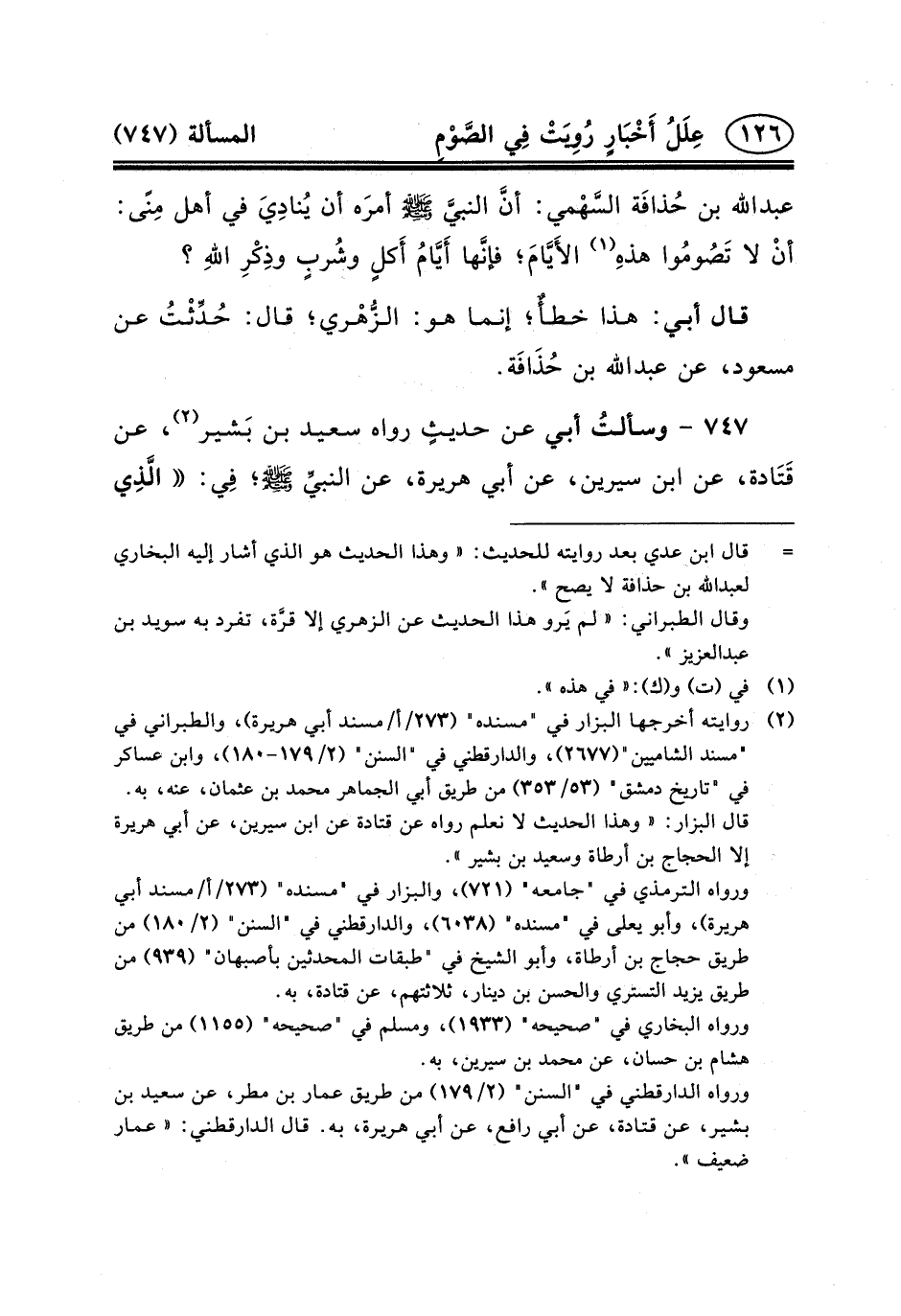 ٧٤٧ - وسألتُ أَبِي عَنْ حديثٍ رواه سعيد ابن بَشير (٢) ، عَنْ قَتَادة، عَنِ ابْنِ سِيرِينَ، عَنْ أَبِي هُرَيْرَةَ، عَنِ النبيِّ (ص) ؛ فِي: الَّذِي