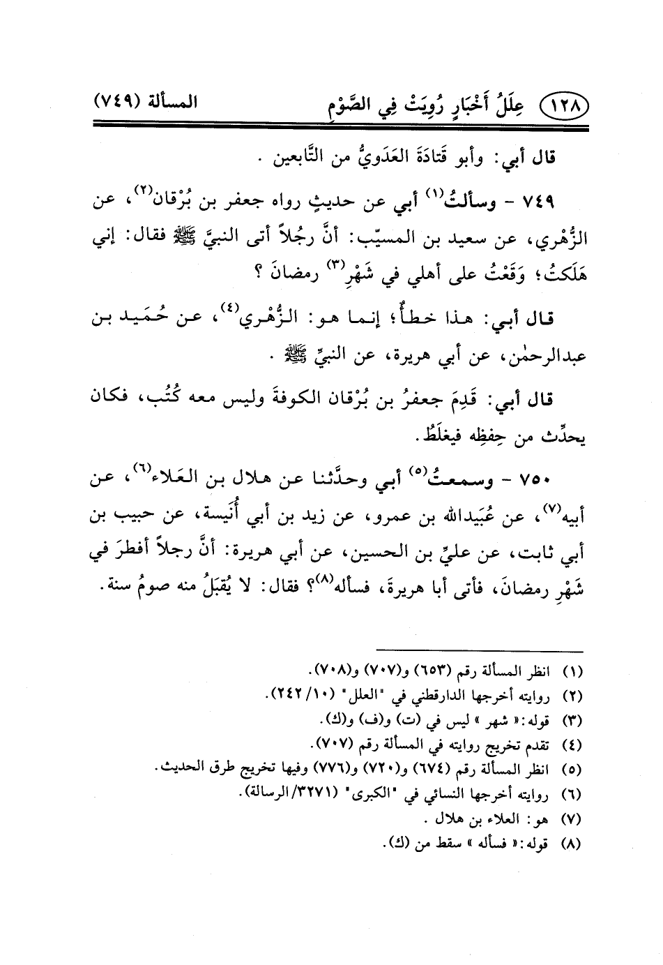 ٧٤٩ - وسألتُ (١) أَبِي عَنْ حديثٍ رَوَاهُ جَعْفَرُ بْنُ بُرْقان (٢) ، عَنِ الزُّهْري، عَنْ سَعِيدِ بْنِ الْمُسَيِّبِ: أنَّ رجُلاً أَتَى النبيَّ (ص) فَقَالَ: إِنِّي هَلَكتُ؛ وَقَعْتُ عَلَى أَهْلِي فِي شَهْرِ (٣) رمضانَ؟
