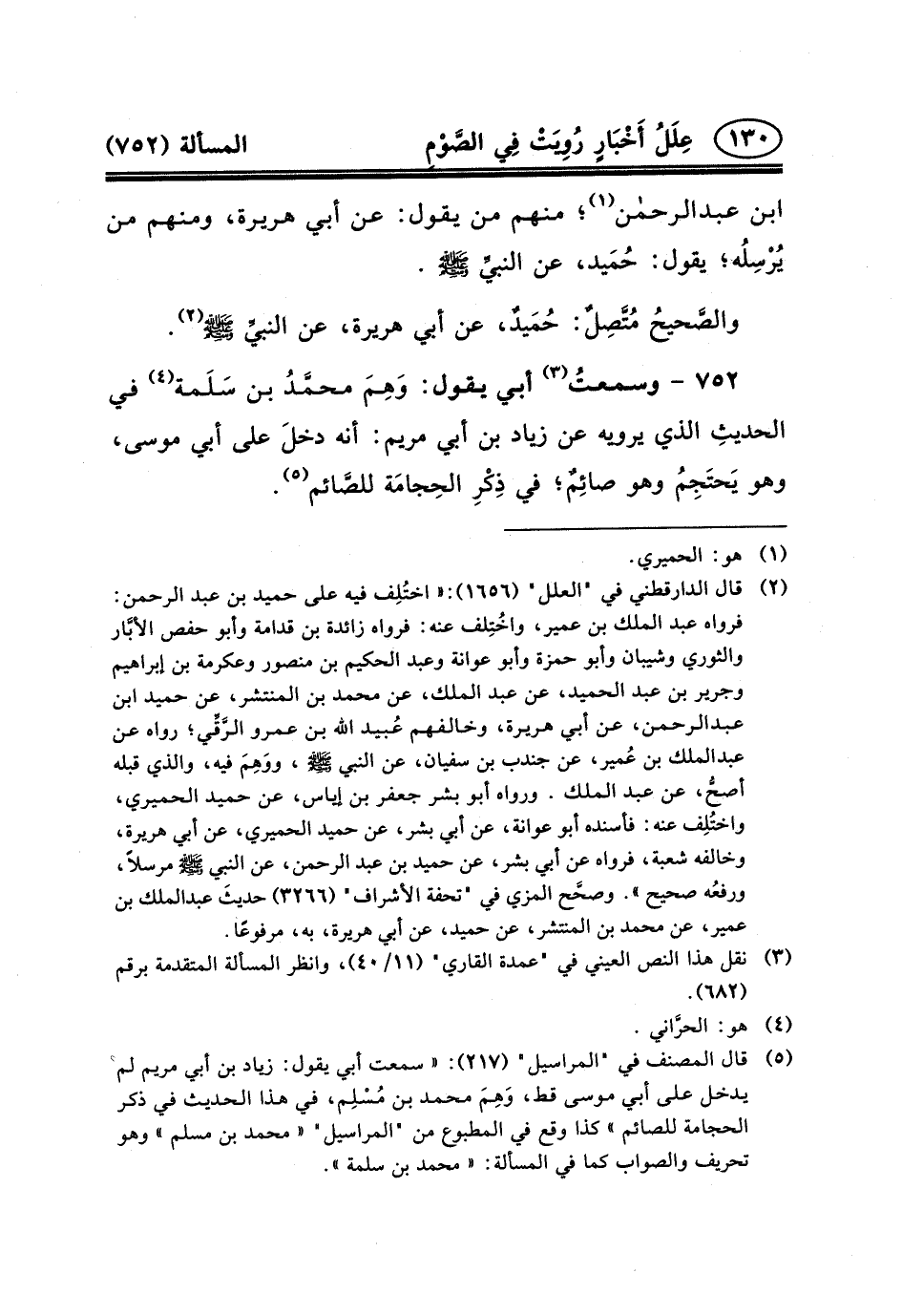 بن عبد الرحمن (١) ؛ منهم من يَقُولُ: عَنْ أَبِي هُرَيْرَةَ، وَمِنْهُمْ مِنْ يُرْسِلُه؛ يَقُولُ: حُمَيد، عن النبيِّ (ص) .