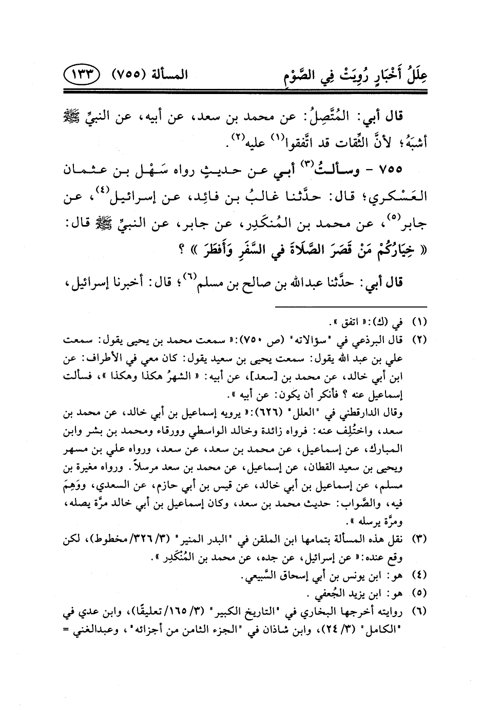 ٧٥٥ - وسألتُ (٣) أَبِي عَنْ حديثٍ رَوَاهُ سَهْل بْنُ عُثْمَانَ العَسْكري؛ قال: حدَّثنا غالبُ ابن فائِد، عَنْ إِسْرَائِيلَ (٤) ، عَنْ جَابِرٍ (٥) ، عَنْ مُحَمَّدِ بْنِ المُنكَدِر، عَن جابر، عن النبيِّ (ص) قَالَ: خِيَارُكُمْ مَنْ قَصَرَ الصَّلَاةَ فِي السَّفَرِ وَأَفطَرَ؟