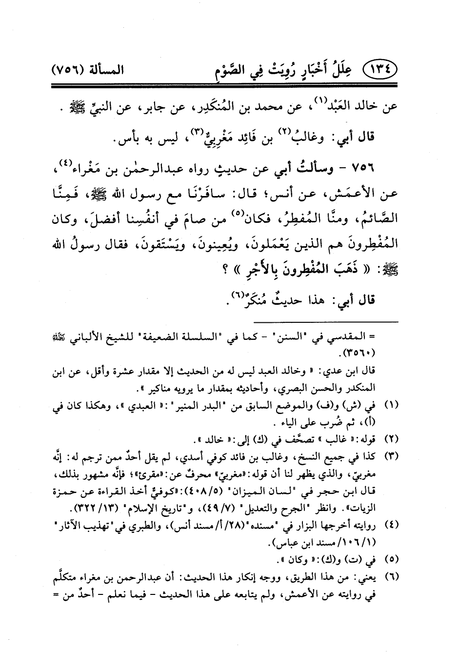 ٧٥٦ - وسألتُ أبي عن حديثٍ رواه عبد الرحمن بْنُ مَغْراء (٤) ، عَنِ الأعمَش، عَنْ أَنَسٍ؛ قَالَ: سافَرْنَا مَعَ رَسُولِ الله (ص) ، فَمِنَّا الصَّائمُ، ومنَّا المُفطِرُ، فكان (٥) من صامَ فِي أنفُسِنا أفضلَ، وَكَانَ المُفْطِرونََ هم الذين يَعْمَلونَ، ويُعِينونَ، ويَسْتَقونَ، فقال رسولُ الله (ص) : ذَهَبَ المُفْطِرونَ بِالأَجْرِ؟