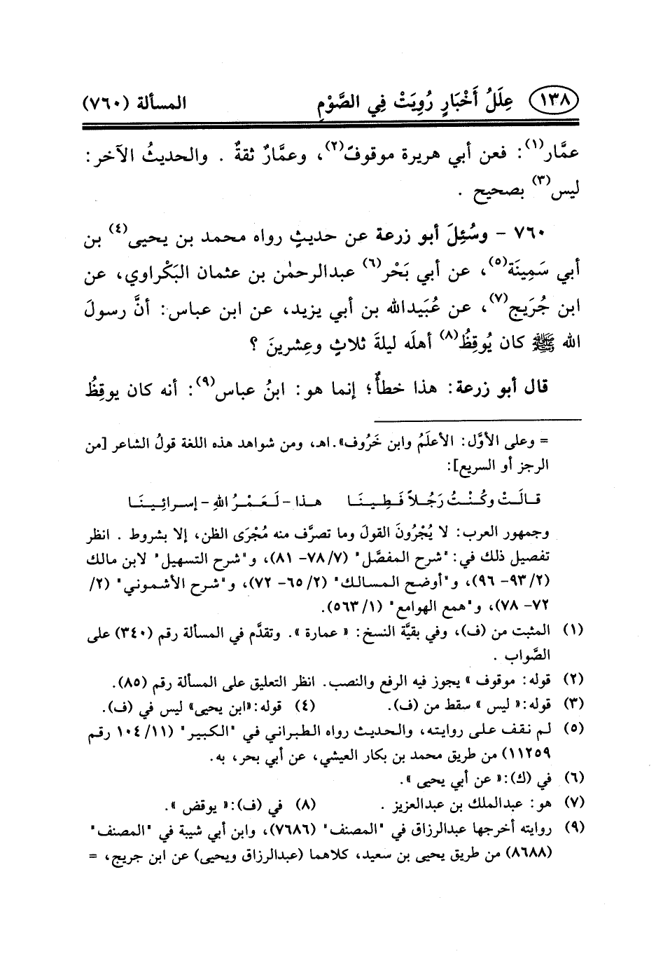 ٧٦٠ - وسُئِلَ أَبُو زُرْعَةَ عَنْ حديثٍ رَوَاهُ مُحَمَّدُ بْنُ يَحْيَى (٤) بْنِ أَبِي سَمِينَة (٥) ، عَنْ أَبِي بَحْر (٦) عبد الرحمن بْنِ عُثْمَانَ البَكْراوي، عَنِ ابْنِ جُرَيج (٧) ، عن عُبَيدالله بْنِ أَبِي يَزِيدَ، عَنِ ابْنِ عباس: أنَّ رسولَ الله (ص) كَانَ يُوقِظُ (٨) أهلَه ليلةَ ثلاثٍ وعِشرينَ؟