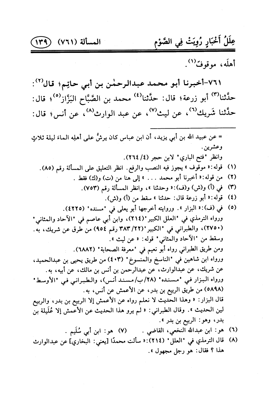 ٧٦١-أخبرنا أبو محمد عبد الرحمن بْنُ أَبِي حاتِم؛ قَالَ (٢) : حدَّثنا (٣) أَبُو زُرْعَةَ؛ قَالَ: حدَّثنا (٤) مُحَمَّدُ بْنُ الصَّبَّاح البَزَّاز (٥) ؛