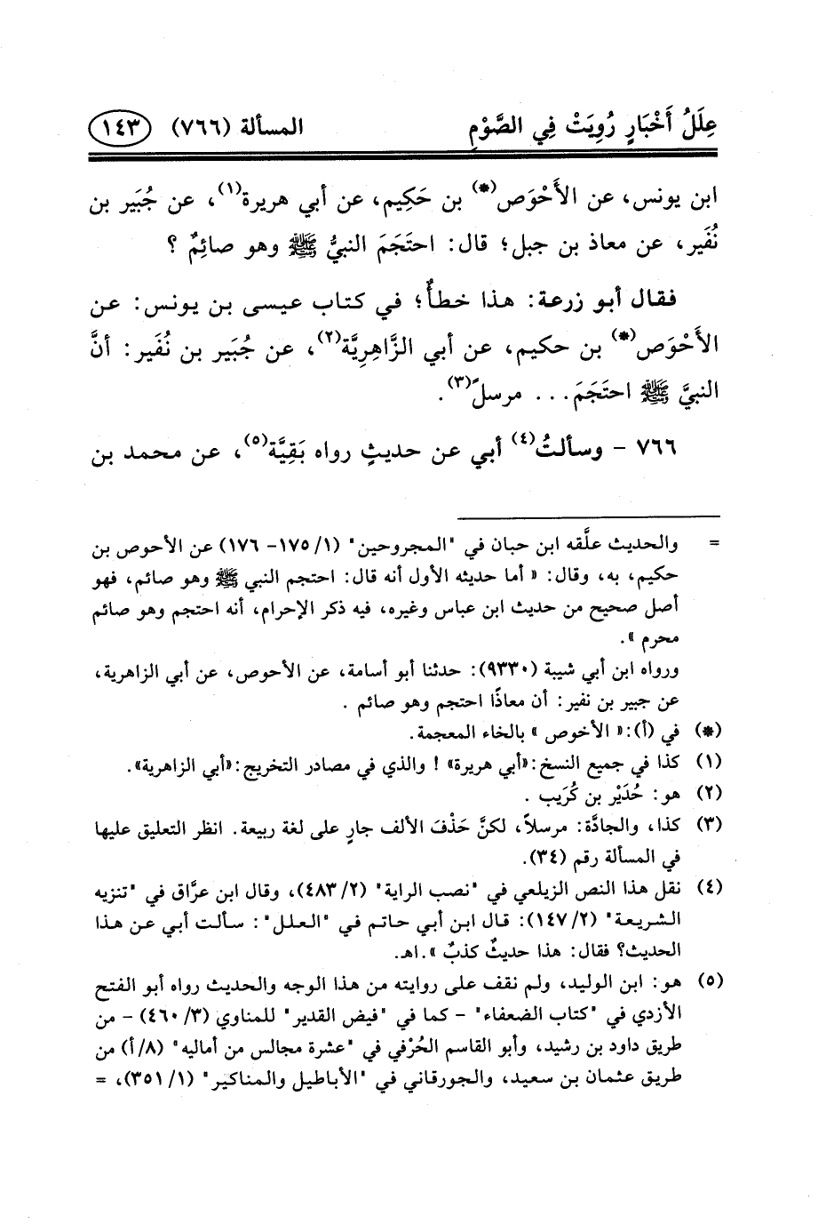 فَقَالَ أَبُو زُرْعَةَ: هَذَا خطأٌ؛ فِي كِتَابِ عِيسَى ابن يُونُسَ: عَنِ الأَحْوَص (*) بْنِ حَكِيمٍ، عَنْ أَبِي الزَّاهِرِيَّة (٢) ، عَنْ جُبَير بن نُفَير: أنَّ النبيَّ (ص) احتَجَمَ ... مُرْسَلٌ (٣) .
