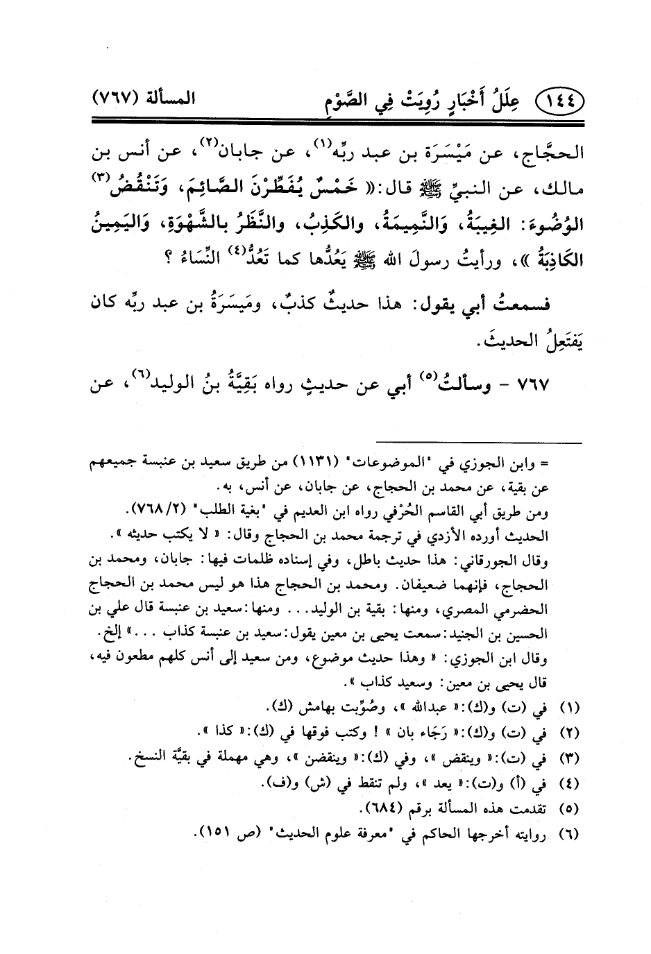الحجَّاج، عَنْ مَيْسَرَة بْنِ عَبْدِ ربِّه (١) ، عَنْ جَابَانَ (٢) ، عَنْ أَنَسِ بن مالك، عن النبيِّ (ص) قال: خَمْسٌ يُفَطِّرْنَ الصَّائِمَ، وَتَنْقُضُ (٣) الوُضُوءَ: الغِيبَةُ، وَالنَّمِيمَةُ، والكَذِبُ، والنَّظَرُ بالشَّهْوَةِ، وَاليَمِينُ الكَاذِبَةُ، ورأيتُ رسولَ الله (ص) يَعُدُّها كما تَعُدُّ (٤) النِّسَاءُ؟