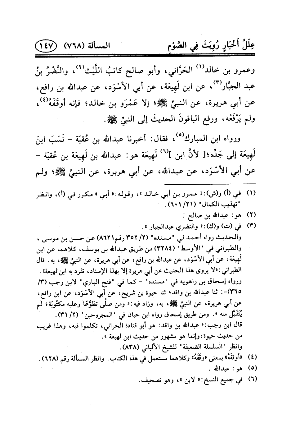 وَعَمْرُو بْنُ خَالِدٍ (١) الحَرَّاني، وَأَبُو صالح كاتبُ اللَّيْث (٢) ، والنَّضْرُ ابنُ عَبْدِ الجبَّار (٣) ، عَنِ ابْنِ لَهِيعَة، عن أبي الأسْوَد، عن عبد الله بْنِ رَافِعٍ، عَنْ أَبِي هُرَيْرَةَ، عن النبيِّ (ص) ؛ إِلا عَمْرَو بْنَ خَالِدٍ؛ فَإِنَّهُ أوقَفَهُ (٤) ، وَلَمْ يَرْفَعْه، وَرَفَعَ الباقونَ الحديثَ إلى النبيِّ (ص) .