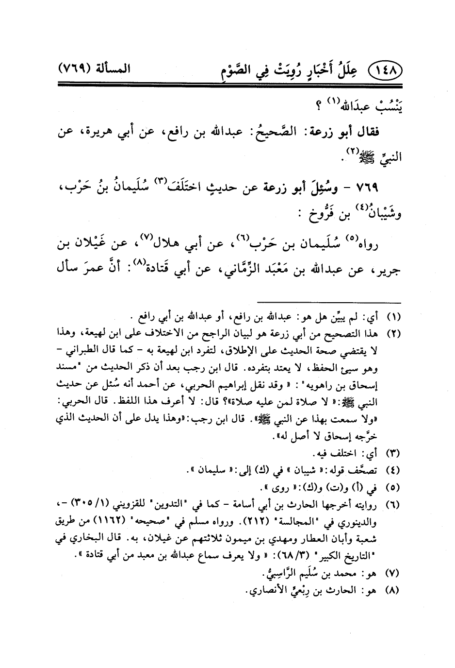 ٧٦٩ - وسُئِلَ أَبُو زُرْعَةَ عَنْ حديثٍ اختَلَفَ (٣) سُلَيمانُ بنُ حَرْب، وشَيْبانُ (٤) بن فَرُّوخ: