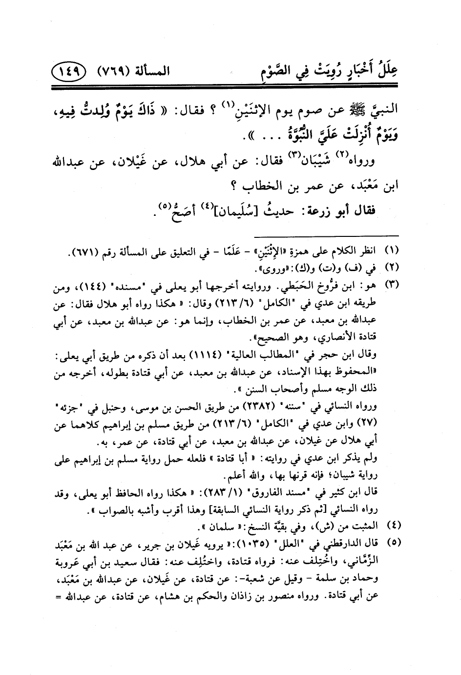 (٥) قال الدارقطني في "العلل" (١٠٣٥) : «يرويه غَيلان بْنِ جَرِيرٍ، عَنْ عَبْدِ الله بن مَعْبَد الزِّمَّاني، واخُتِلف عنه: فرواه قتادة، واختُلِف عنه: فقال سعيد بن أبي عَروبة وحماد بن سلمة - وقيل عَنْ شُعْبَةَ-: عَنْ قَتَادَةَ، عَنْ غَيلان، عن عبد الله بن مَعْبَد، عن أبي قتادة. ورواه منصور بن زاذان والحكم بن هشام، عن قتادة، عن عبد الله بن مَعْبَد، عن أبي قتادة، لم يذكُر بينهما غَيلان. وقيل: عن الحكم، عن أيوب، عن عبد الله بن مَعْبَد؛ ولا يصحُّ ذكر أيوب فيه. ورواه شعبة بن الحجَّاج ومهدي بن ميمون وأبان العطار وأبو هلال الرَّاسبي وحماد بن زيد عَنْ غَيلان، عَنْ عَبْدِ اللَّهِ بن مَعْبَد، عن أبي قتادة، إلا أن أبا هلال من بينهم جعله عن أبي قتادة، عن عمر بن الخطَّاب ح. والصَّحيح: عن أبي قتادة: أنه سمع رجلاً سأل النبيَّ (ص) عن الصيام؟ فقال عمر بن الخطَّاب: يا رسول الله! كيف من يصومُ الدَّهر؟