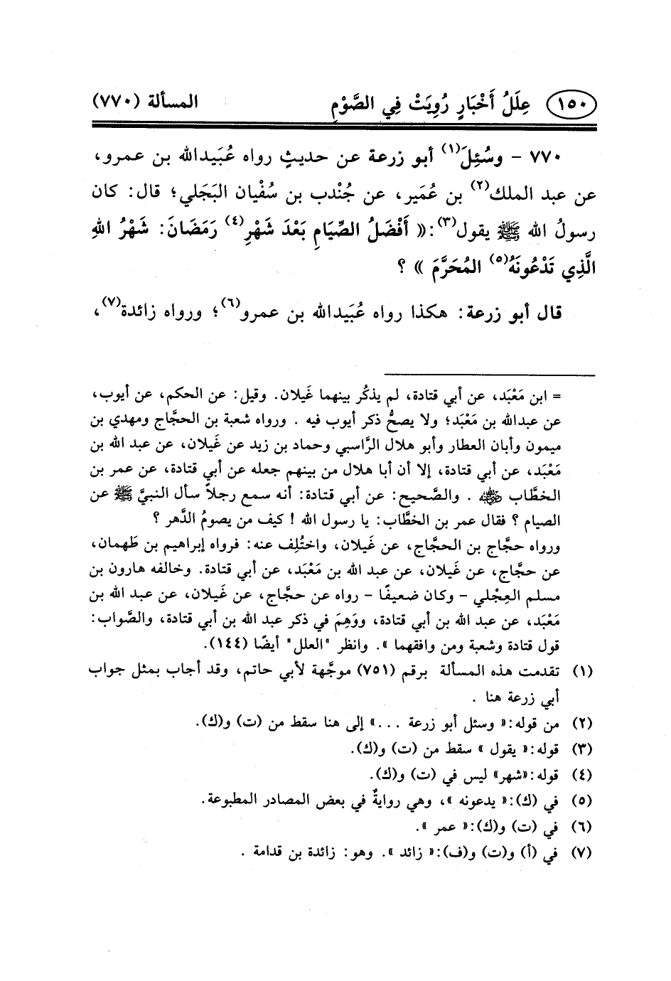 ٧٧٠ - وسُئِلَ (١) أَبُو زُرْعَةَ عَنْ حديثٍ رواه عُبَيدالله بْنُ عَمْرٍو، عَنْ عَبْدِ الْمَلِكِ (٢) بْنِ عُمَير، عَنْ جُنْدب بْنِ سُفْيان البَجَلي؛ قَالَ: كَانَ رسولُ الله (ص) يَقُولُ (٣) : أَفْضَلُ الصِّيَامِ بَعْدَ شَهْرِ (٤) رَمَضَانَ: شَهْرُ اللهِ الَّذِي تَدْعُونَهُ (٥) المُحَرَّمَ؟
