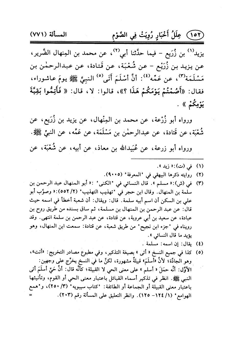يَزِيدَ (١) بْنِ زُرَيع - فِيمَا حدَّثنا أَبِي (٢) ، عَنْ مُحَمَّدِ بْنِ المِنهال الضَّرير، عَنْ يَزِيدَ بْنِ زُرَيْع - عَنْ شُعْبَة، عَنْ قَتادة، عَنْ عبد الرحمن بْنِ مَسْلَمَة (٣) ، عَنْ عَمِّه (٤) : أنَّ أسْلَمَ أَتَى (٥) النبِيَّ (ص) يومَ عَاشُورَاءَ، فَقَالَ: أَصُمْتُمْ يَوْمَكُمْ هَذَا؟ ، قَالُوا: لا، قَالَ: فَأَتِمُّوا بَقِيَّةَ يَوْمِكُمْ.