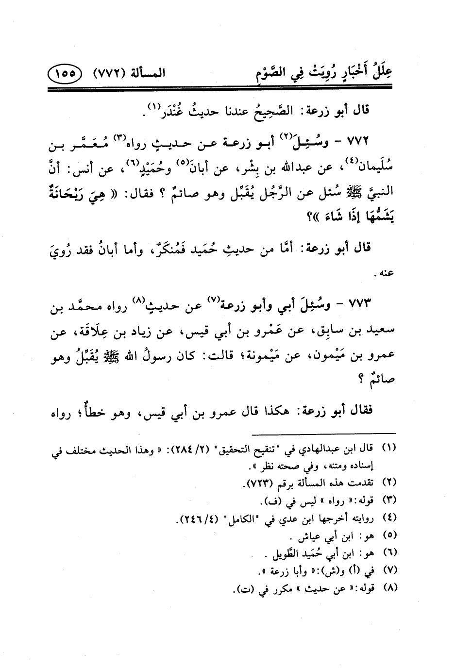 ٧٧٢ - وسُئِلَ (٢) أَبُو زُرْعَةَ عَنْ حديثٍ رَوَاهُ (٣) مُعَمَّر بْنُ سُلَيمان (٤) ، عن عبد الله بْنِ بِشْر، عَنْ أبانَ (٥) وحُمَيْدٍ (٦) ، عن أنس: أنَّ النبيَّ (ص) سُئل عَنِ الرَّجُل يُقَبِّل وَهُوَ صائمٌ؟ فَقَالَ: هِيَ رَيْحَانَةٌ يَشَمُّهَا إذَا شَاءَ؟