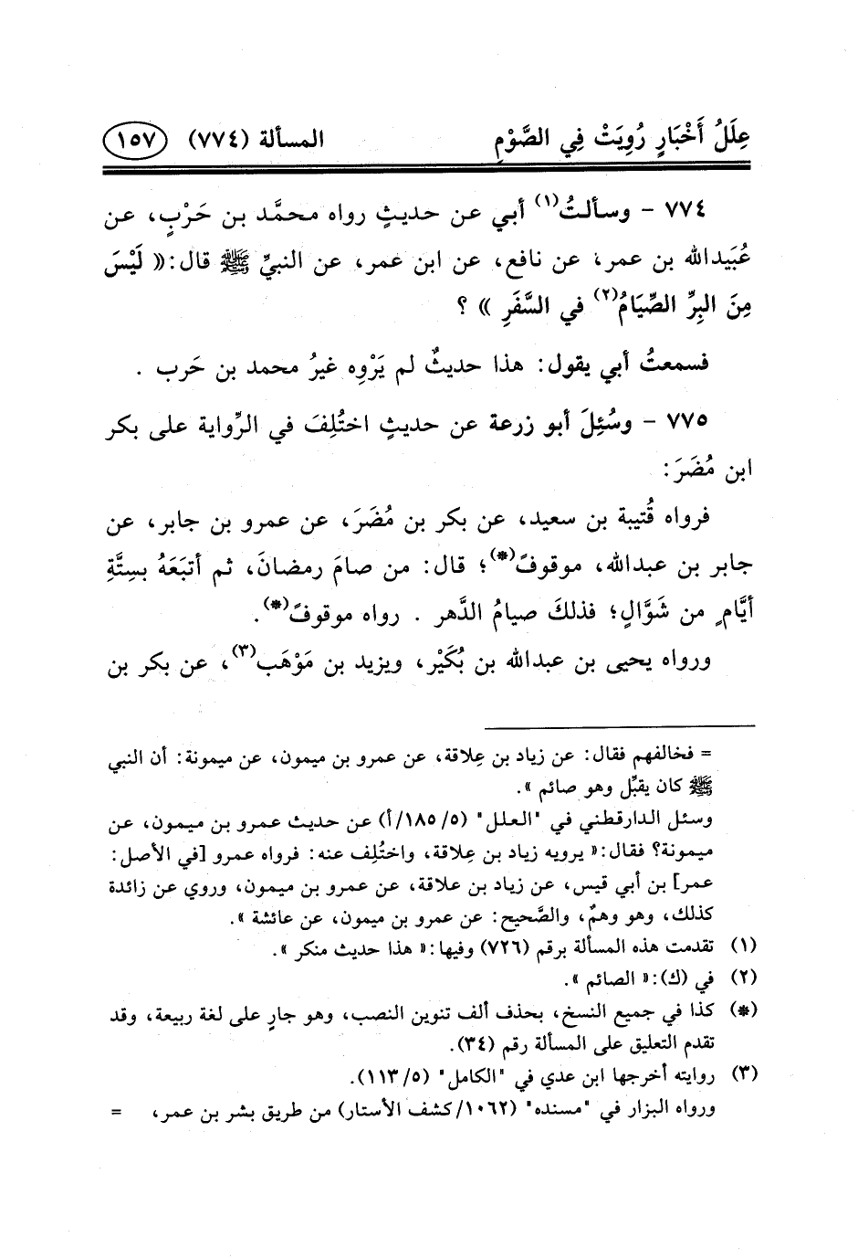 ٧٧٤ - وسألتُ (١) أَبِي عَنْ حديثٍ رَوَاهُ محمَّد بن حَرْبٍ، عن عُبَيدالله بْنِ عُمَرَ، عَنْ نَافِعٍ، عَنِ ابن عمر، عن النبيِّ (ص) قَالَ: لَيْسَ مِنَ البِرِّ الصِّيَامُ (٢)