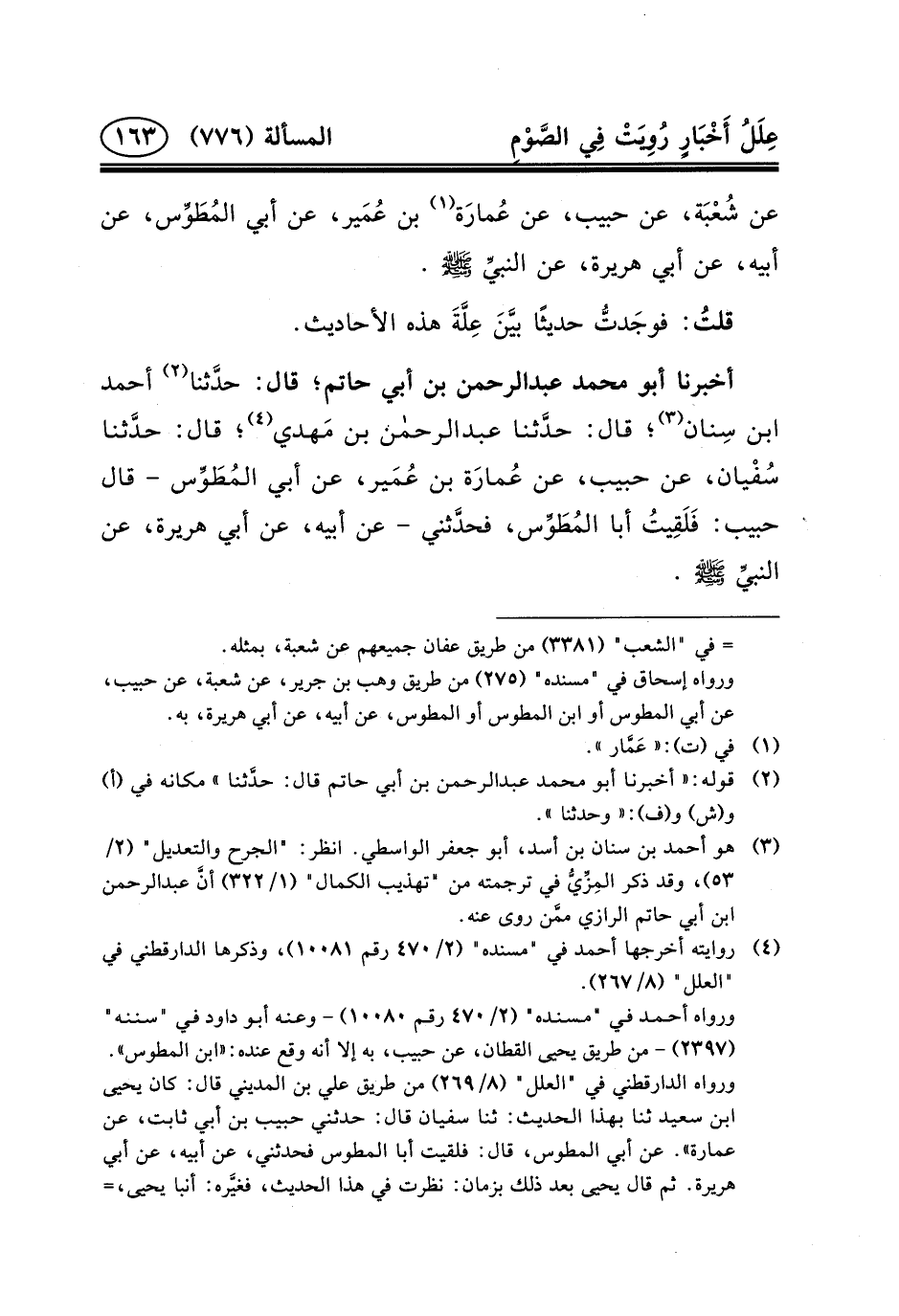 أَخْبَرَنَا أَبُو مُحَمَّدٍ عبد الرحمن بْنُ أَبِي حاتِم؛ قَالَ: حدَّثنا (٢) أحمد ابن سِنان (٣) ؛ قال: حدَّثنا عبد الرحمن بْنُ مَهدي (٤) ؛ قَالَ: حدَّثنا سُفْيان، عَنْ حَبِيبٍ، عَنْ عُمارَة بْنِ عُمَير، عَنْ أَبِي المُطَوِّس - قَالَ حَبِيبٌ: فَلَقِيتُ أَبَا المُطَوِّس، فحدَّثني - عَنْ أَبِيهِ، عَنْ أَبِي هُرَيْرَةَ، عن النبيِّ (ص) .