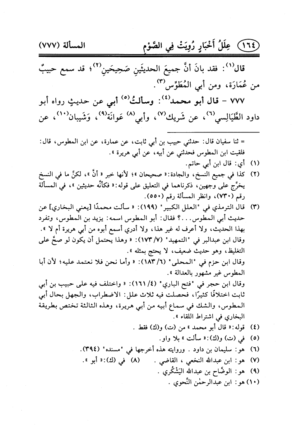 ٧٧٧ - قَالَ أَبُو مُحَمَّدٍ (٤) : وسألتُ (٥) أَبِي عَنْ حديثٍ رَوَاهُ أَبُو دَاوُدَ الطَّيَالِسي (٦) ، عَنْ شَريك (٧) ، وَأَبِي (٨) عَوانَة (٩) ، وَشَيبان (١٠) ، عَنْ
