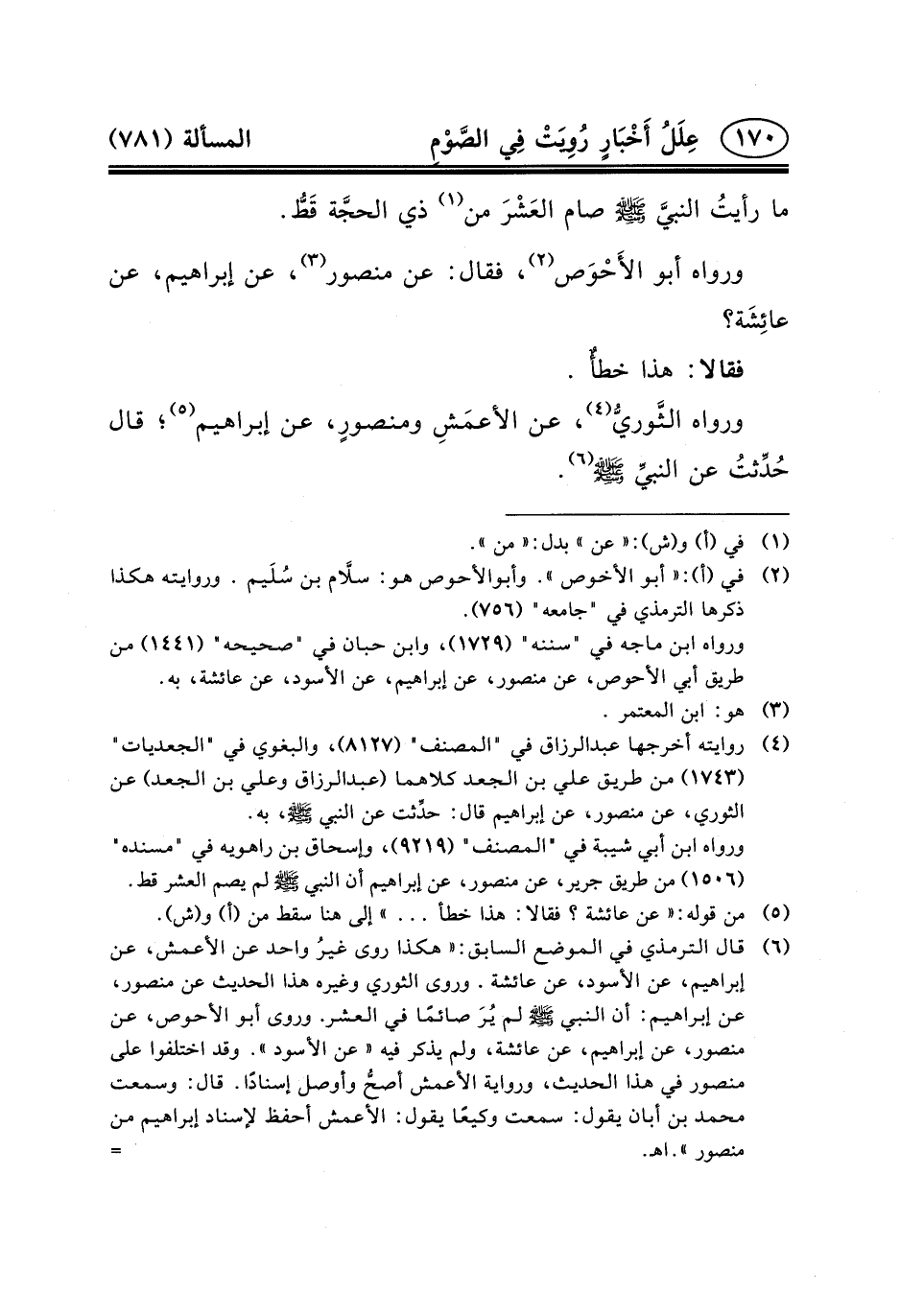 (٦) قال الترمذي في الموضع السابق: «هكذا روى غيرُ واحد عَنِ الأَعْمَشِ، عَنْ إِبْرَاهِيمَ، عَن الأسود، عن عائشة. وروى الثوري وغيره هَذَا الْحَدِيثُ عَنْ مَنْصُورٍ، عَنْ إبراهيم: أن النبي (ص) لم يُرَ صائمًا في العشر. وروى أبو الأحوص، عَنْ مَنْصُورٍ، عَنْ إِبْرَاهِيمَ، عَنْ عائشة، ولم يذكر فيه «عن الأسود» . وقد اختلفوا على منصور في هذا الحديث، ورواية الأعمش أصحُّ وأوصل إسنادًا. قال: وسمعت محمد بن أبان يقول: سمعت وكيعًا يقول: الأعمش أحفظ لإسناد إبراهيم من منصور» . اهـ.