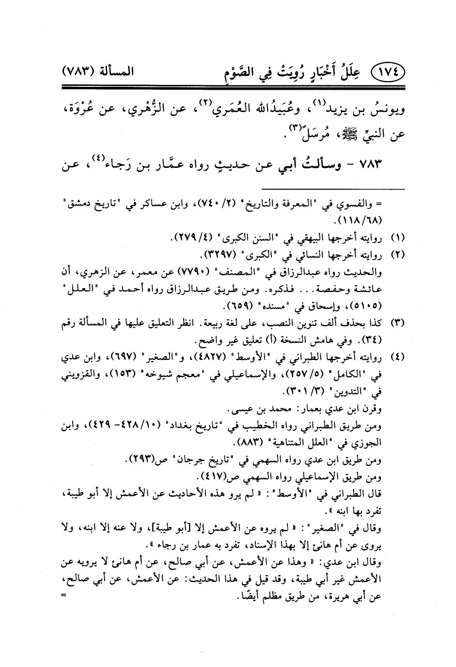 ٧٨٣ - وسألتُ أَبِي عَنْ حديثٍ رواه عمَّار ابن رَجاء (٤) ،