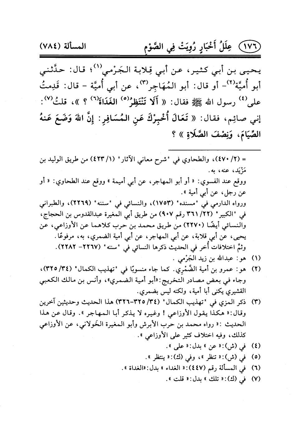 يَحْيَى بْنِ أَبِي كَثِيرٍ، عَنْ أَبِي قِلابة الجَرْمي (١) ؛ قَالَ: حدَّثني أَبُو أُميَّة (٢) - أَوْ قَالَ: أَبُو المُهَاجِر (٣) ، عَنْ أَبِي أُميَّة - قَالَ: قَدِمتُ على (٤) رسول الله (ص) فَقَالَ: أَلَا تَنْتَظِرُ (٥) الغَدَاةَ (٦) ؟ ، قلتُ (٧) : إِنِّي صائِم، فَقَالَ: تَعَالَ أُخْبِرْكَ عَنِ المُسَافِرِ: إِنَّ اللهَ وَضَعَ عَنهُ الصِّيَامَ، وَنِصْفَ الصَّلَاةِ؟