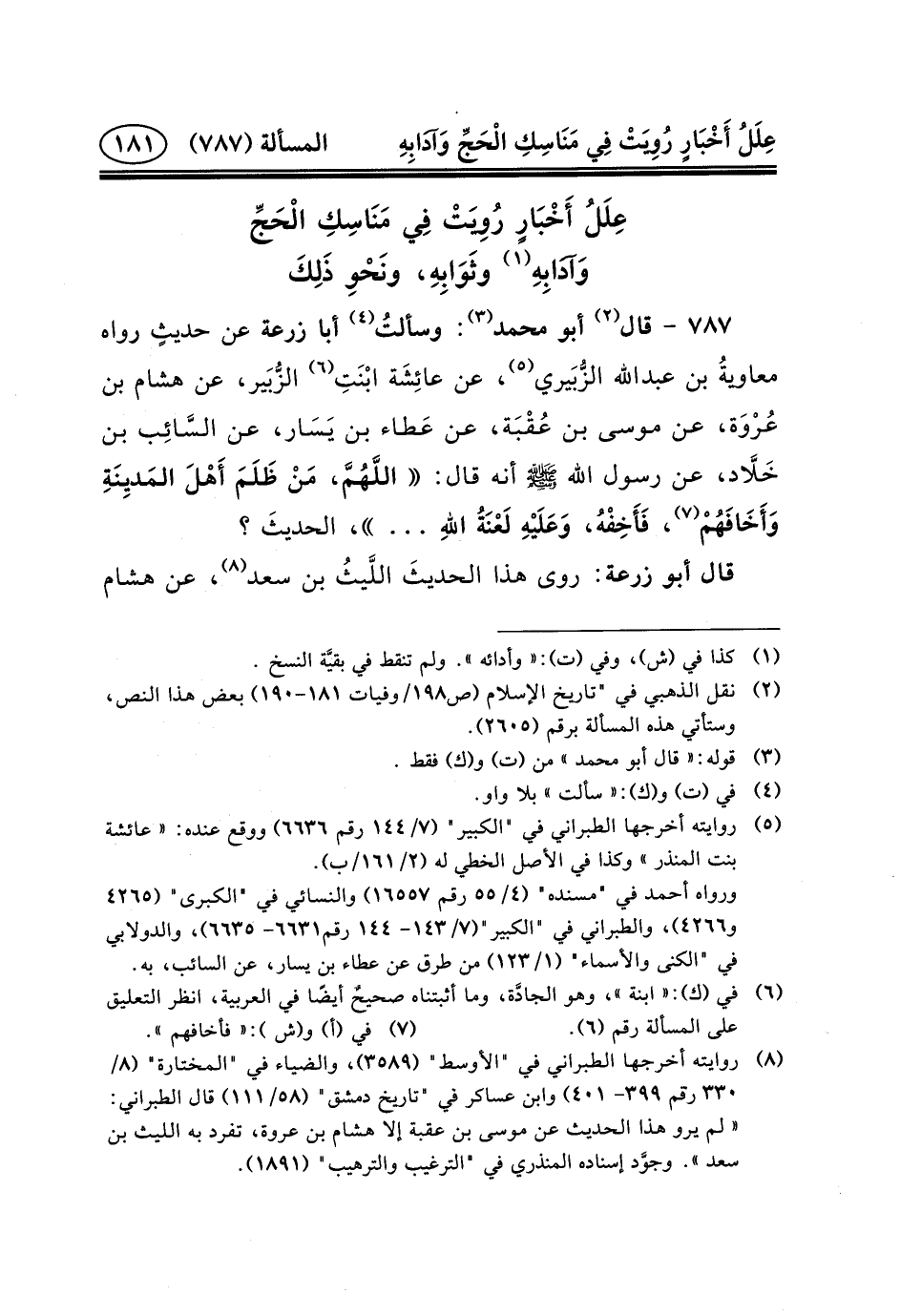 ٧٨٧ - قَالَ (٢) أَبُو مُحَمَّدٍ (٣) : وسألتُ (٤) أَبَا زُرْعَةَ عَنْ حديثٍ رواه معاويةُ بن عبد الله الزُّبَيري (٥) ، عن عائِشَة ابْنَتِ (٦) الزُّبَير، عَنْ هِشَامِ بْنِ عُرْوَة، عَنْ مُوسَى بْنِ عُقْبَة، عَنْ عَطاء بْنِ يَسَار، عَنِ السَّائِب بْنِ خَلَاّد، عَنْ رَسُولِ اللَّهِ (ص) أَنَّهُ قَالَ: اللَّهُمَّ، مَنْ ظَلَمَ أَهْلَ المَديِنَةِ وَأَخَافَهُمْ (٧) ، فَأَخِفْهُ، وَعَلَيْهِ لَعْنَةُ اللهِ ... ، الحديثَ؟