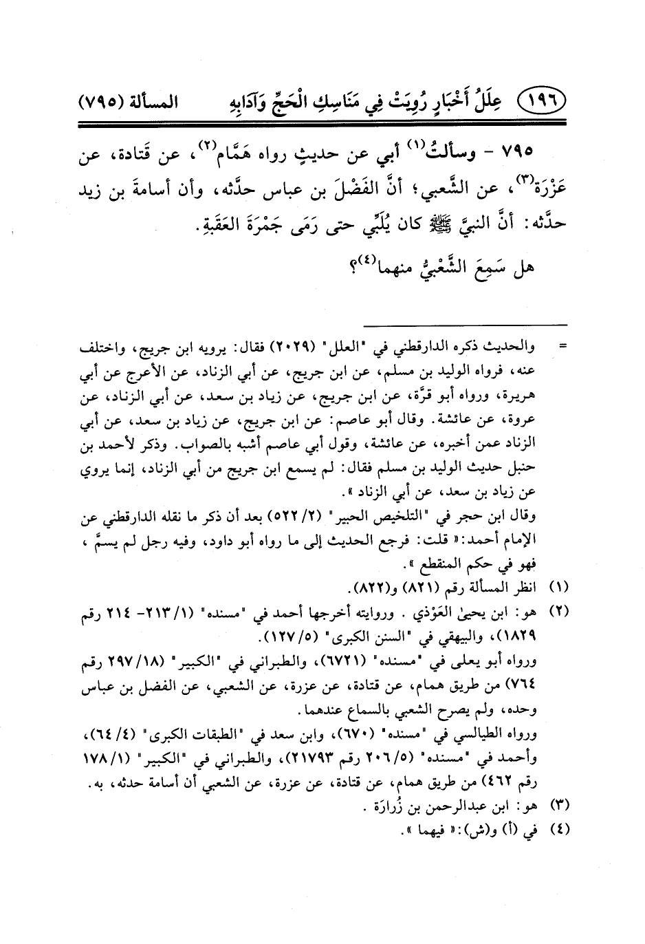 عَنْ قَتادة، عَنْ عَزْرَة (٣) ، عَنِ الشَّعبي؛ أنَّ الفَضْلَ بْنَ عباس حدَّثه، وأن أسامةَ بْنَ زَيْدٍ حدَّثه: أنَّ النبيَّ (ص) كَانَ يُلَبِّي حَتَّى رَمَى جَمْرَةَ العَقَبةِ.