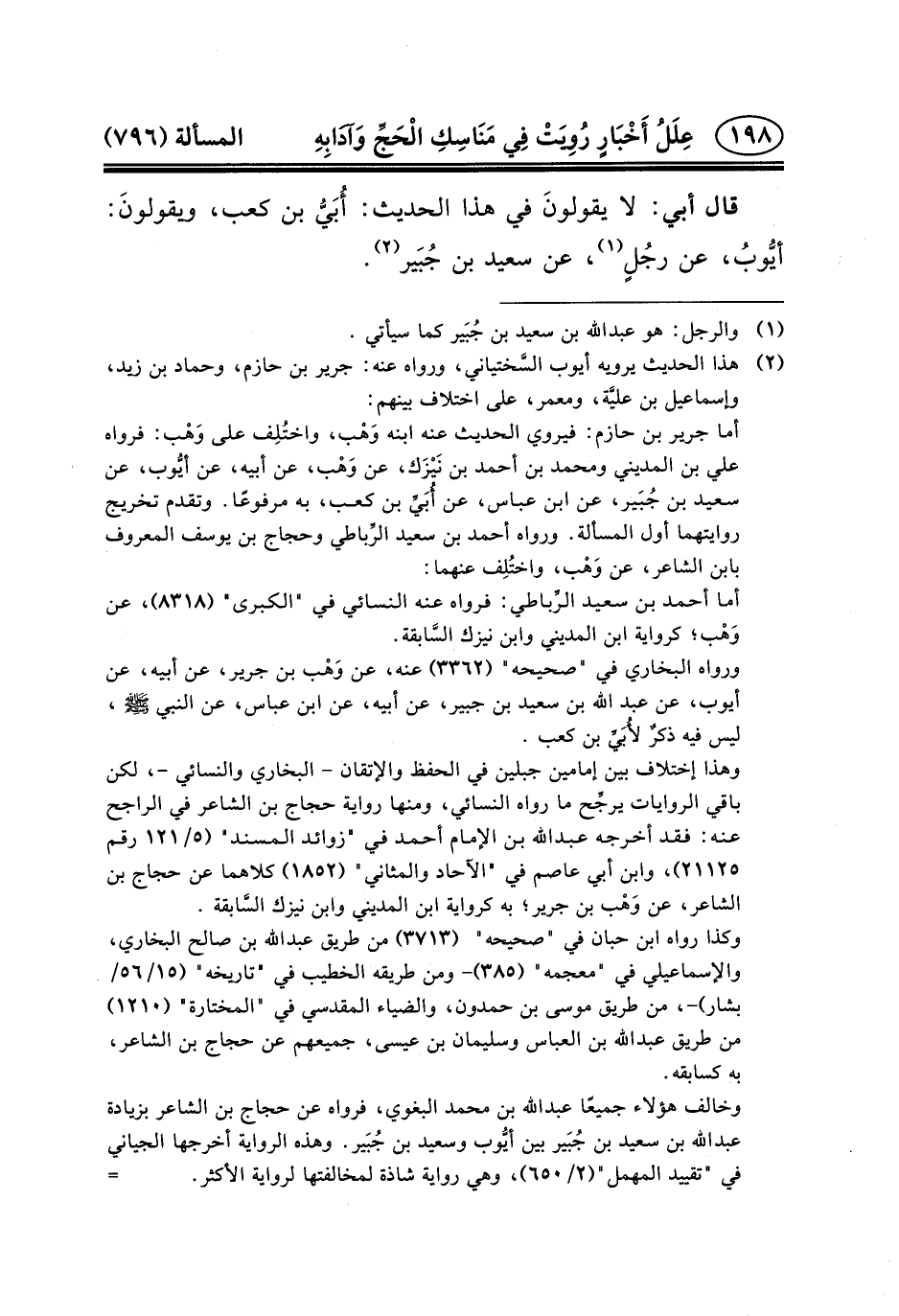 قَالَ أَبِي: لا يقولونَ فِي هذا الحديث: أُبَيُّ ابن كَعْبٍ، ويقولونَ: أيُّوبُ، عَنْ رجُلٍ (١) ، عن سعيد بن جُبَير (٢) .