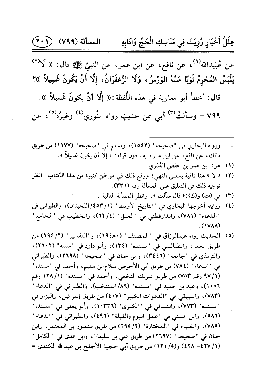 عن عُبَيدالله (١) ، عَنْ نَافِعٍ، عَنِ ابْنِ عُمَرَ، عن النبيِّ (ص) قَالَ: لَا (٢) يَلْبَسُ المُحْرِمُ ثَوْبًا مَسَّهُ الوَرْسُ، وَلَا الزَّعْفَرَانُ، إِلَاّ أَنْ يَكُونَ غَسِيلاً؟