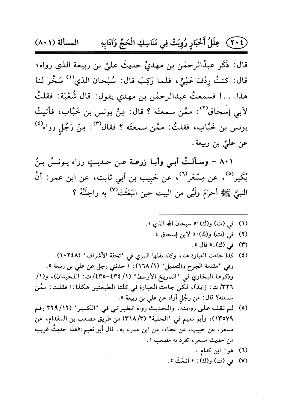 ٨٠١ - وسألتُ أَبِي وَأَبَا زُرْعَةَ عَنْ حديثٍ رَوَاهُ يونسُ بنُ بُكَير (٥) ، عَنْ مِسْعَر (٦) ، عَنْ حَبِيب بْنِ أَبِي ثَابِتٍ، عَنِ ابْنِ عمر: أنَّ النبيَّ (ص) أحرَمَ ولَبَّى مِنَ الْبَيْتِ حِينَ انبَعَثَتْ (٧) به راحِلَتُهُ؟