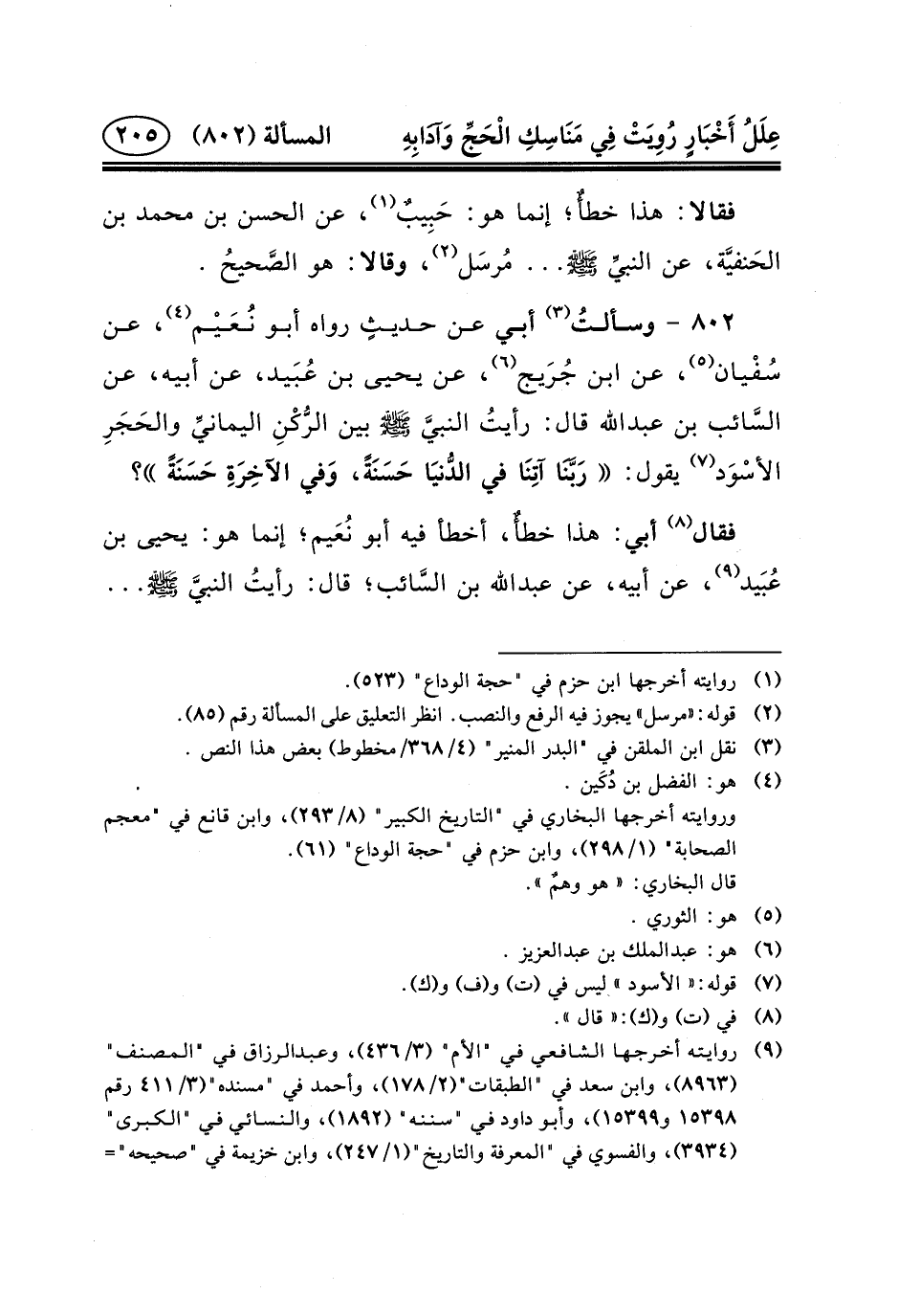 ٨٠٢ - وسألتُ (٣) أَبِي عَن حديثٍ رَوَاهُ أَبُو نُعَيْم (٤) ، عَنْ سُفْيان (٥) ، عَنِ ابْنِ جُرَيج (٦) ، عَنْ يَحْيَى بْنِ عُبَيد، عَنْ أَبِيهِ، عَنِ السَّائب بْنِ عبد الله قال: رأيتُ النبيَّ (ص) بين الرُّكْنِ اليمانيِّ والحَجَرِ الأسْوَد (٧) يَقُولُ: رَبَّنَا آتِنَا فِي الدُّنيَا حَسَنَةً، وَفي الآخِرَةِ حَسَنَةً؟