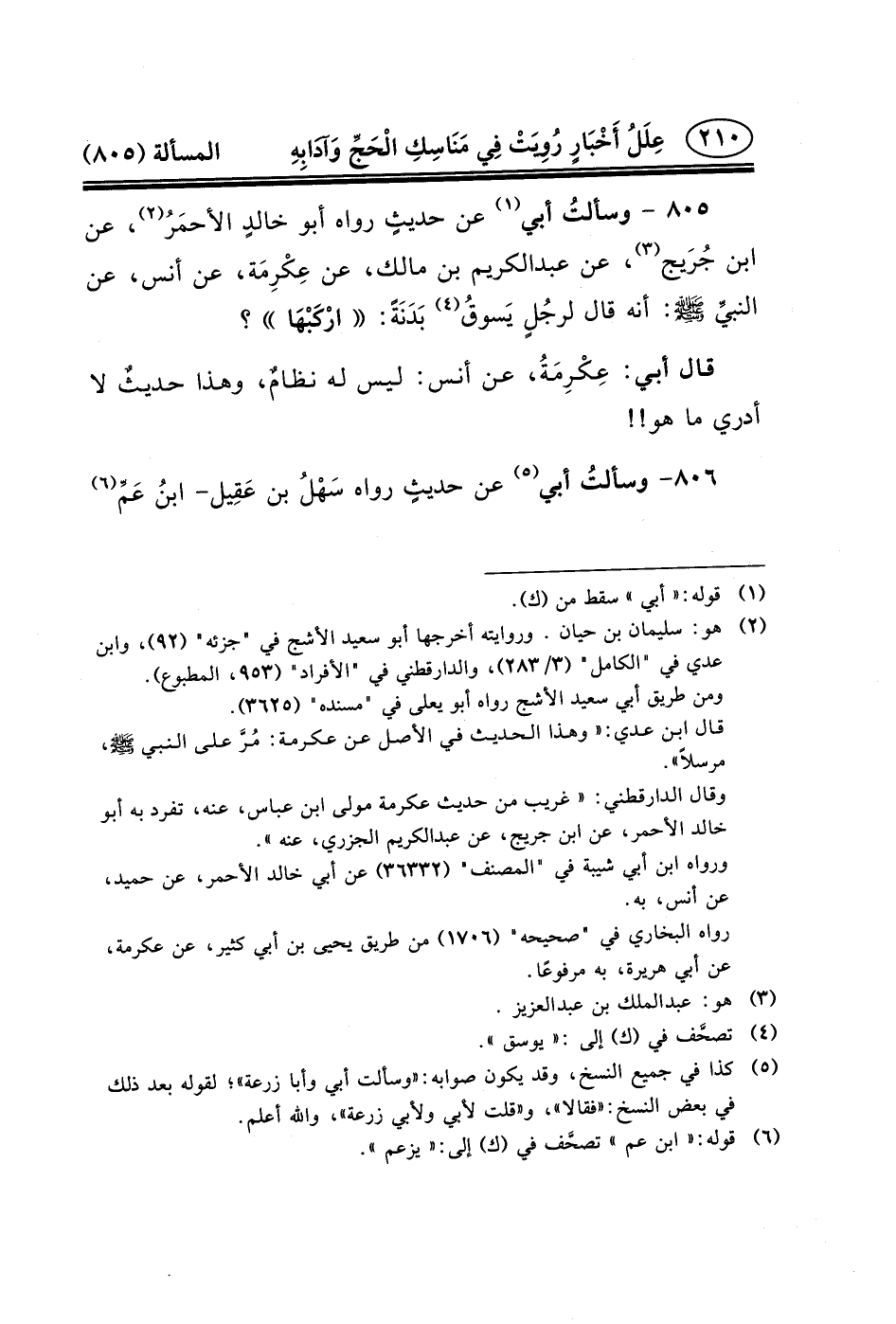 ٨٠٥ - وسألتُ أَبِي (١) عَنْ حديثٍ رَوَاهُ أَبُو خالدٍ الأحمَرُ (٢) ، عَنِ ابْنِ