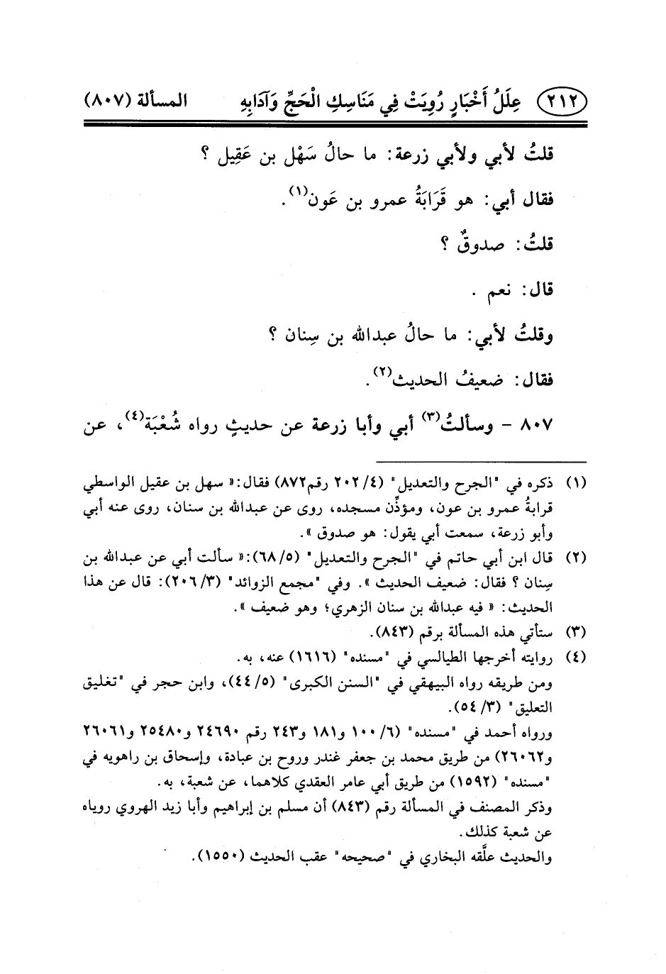 (٢) قال ابن أبي حاتم في "الجرح والتعديل" (٥/٦٨) : «سألت أبي عن عبد الله بْنِ سِنان؟ فَقَالَ: ضَعِيفُ الْحَدِيثِ» . وفي "مجمع الزوائد" (٣/٢٠٦) : قال عن هذا الحديث: «فيه عبد الله بن سنان الزهري؛ وهو ضعيف» .