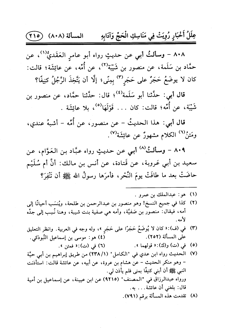 ٨٠٩ - وسألتُ (٨) أَبِي عَنْ حديثٍ رَوَاهُ عبَّاد بْنُ العَوَّام، عَنْ سَعِيدِ بْنِ أَبِي عَروبة، عَنْ قَتادة، عَنْ أَنَسِ بْنِ مَالِكٍ: أنَّ أُمَّ سُلَيْم حاضَتْ بعد ما طافَتْ يومَ النَّحْر، فأمرَها رسولُ الله (ص) أن تَنْفِرَ؟